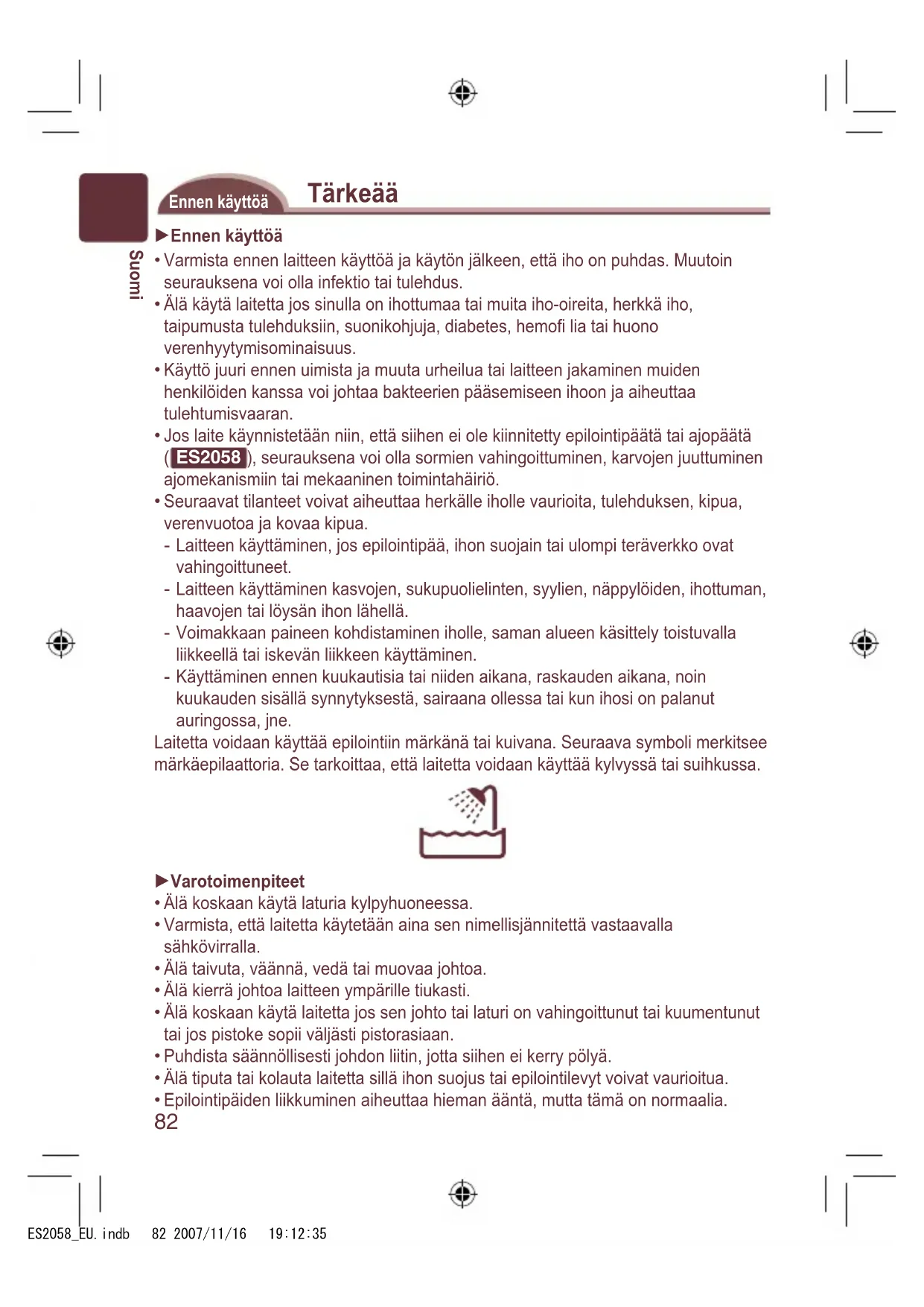ES2058 ), seurauksena voi olla sormien vahingoittuminen, karvojen juuttuminen ajomekanismiin tai mekaaninen toimintahäiriö. Seuraavat tilanteet voivat aiheuttaa herkälle iholle vaurioita, tulehduksen, kipua, verenvuotoa ja kovaa kipua. Laitteen käyttäminen, jos epilointipää, ihon suojain tai ulompi teräverkko ovat vahingoittuneet. Laitteen käyttäminen kasvojen, sukupuolielinten, syylien, näppylöiden, ihottuman, haavojen tai löysän ihon lähellä. Voimakkaan paineen kohdistaminen iholle, saman alueen käsittely toistuvalla liikkeellä tai iskevän liikkeen käyttäminen. Käyttäminen ennen kuukautisia tai niiden aikana, raskauden aikana, noin kuukauden sisällä synnytyksestä, sairaana ollessa tai kun ihosi on palanut auringossa, jne. Laitetta voidaan käyttää epilointiin märkänä tai kuivana. Seuraava symboli merkitsee märkäepilaattoria. Se tarkoittaa, että laitetta voidaan käyttää kylvyssä tai suihkussa. Varotoimenpiteet Älä koskaan käytä laturia kylpyhuoneessa. Varmista, että laitetta käytetään aina sen nimellisjännitettä vastaavalla sähkövirralla. Älä taivuta, väännä, vedä tai muovaa johtoa. Älä kierrä johtoa laitteen ympärille tiukasti. Älä koskaan käytä laitetta jos sen johto tai laturi on vahingoittunut tai kuumentunut tai jos pistoke sopii väljästi pistorasiaan. Puhdista säännöllisesti johdon liitin, jotta siihen ei kerry pölyä. Älä tiputa tai kolauta laitetta sillä ihon suojus tai epilointilevyt voivat vaurioitua. Epilointipäiden liikkuminen aiheuttaa hieman ääntä, mutta tämä on normaalia.