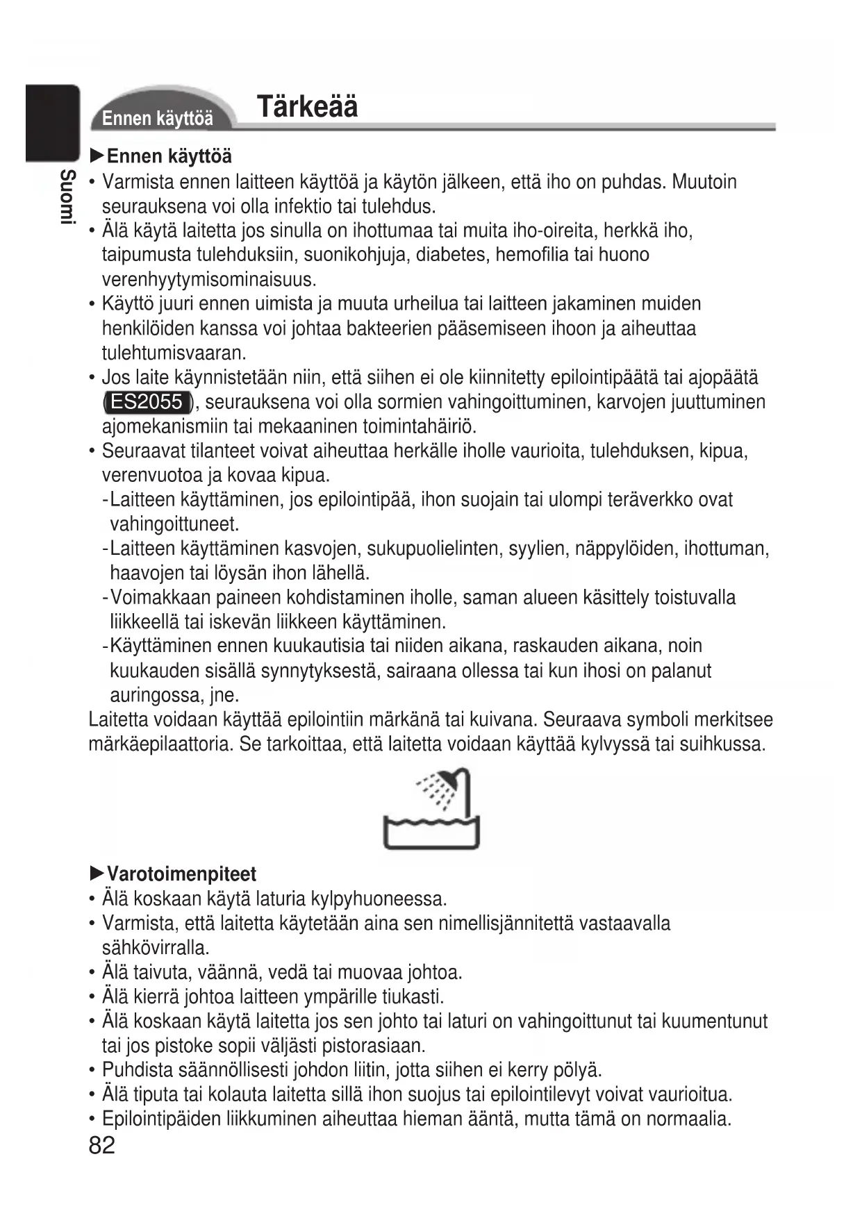 ES2055 ), seurauksena voi olla sormien vahingoittuminen, karvojen juuttuminen ajomekanismiin tai mekaaninen toimintahäiriö. Seuraavat tilanteet voivat aiheuttaa herkälle iholle vaurioita, tulehduksen, kipua, verenvuotoa ja kovaa kipua. Laitteen käyttäminen, jos epilointipää, ihon suojain tai ulompi teräverkko ovat vahingoittuneet. Laitteen käyttäminen kasvojen, sukupuolielinten, syylien, näppylöiden, ihottuman, haavojen tai löysän ihon lähellä. Voimakkaan paineen kohdistaminen iholle, saman alueen käsittely toistuvalla liikkeellä tai iskevän liikkeen käyttäminen. Käyttäminen ennen kuukautisia tai niiden aikana, raskauden aikana, noin kuukauden sisällä synnytyksestä, sairaana ollessa tai kun ihosi on palanut auringossa, jne. Laitetta voidaan käyttää epilointiin märkänä tai kuivana. Seuraava symboli merkitsee märkäepilaattoria. Se tarkoittaa, että laitetta voidaan käyttää kylvyssä tai suihkussa. 1Varotoimenpiteet Älä koskaan käytä laturia kylpyhuoneessa. Varmista, että laitetta käytetään aina sen nimellisjännitettä vastaavalla sähkövirralla. Älä taivuta, väännä, vedä tai muovaa johtoa. Älä kierrä johtoa laitteen ympärille tiukasti. Älä koskaan käytä laitetta jos sen johto tai laturi on vahingoittunut tai kuumentunut tai jos pistoke sopii väljästi pistorasiaan. Puhdista säännöllisesti johdon liitin, jotta siihen ei kerry pölyä. Älä tiputa tai kolauta laitetta sillä ihon suojus tai epilointilevyt voivat vaurioitua. Epilointipäiden liikkuminen aiheuttaa hieman ääntä, mutta tämä on normaalia.