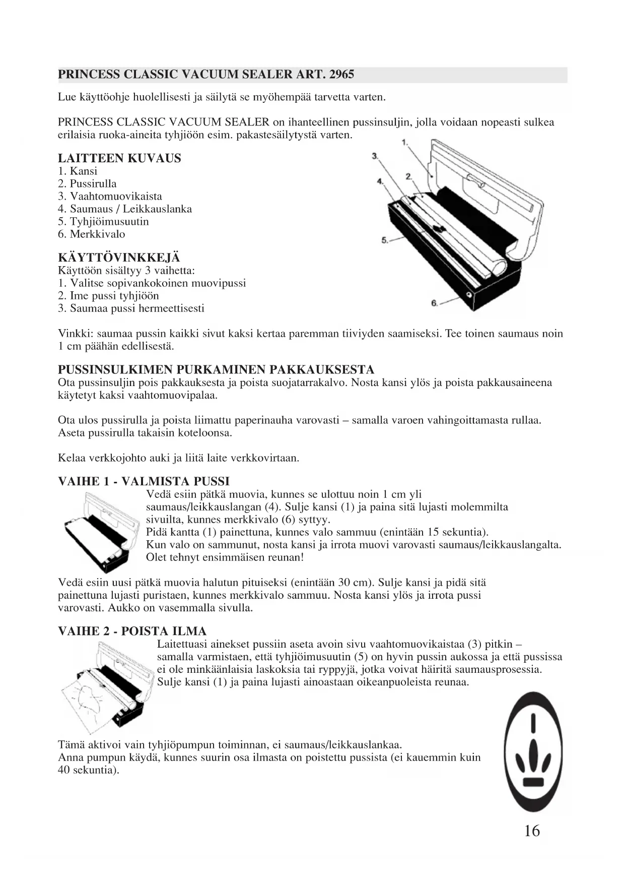 Lue käyttöohje huolellisesti ja säilytä se myöhempää tarvetta varten. PRINCESS CLASSIC VACUUM SEALER on ihanteellinen pussinsuljin, jolla voidaan nopeasti sulkea erilaisia ruoka-aineita tyhjiöön esim. pakastesäilytystä varten. LAITTEEN KUVAUS