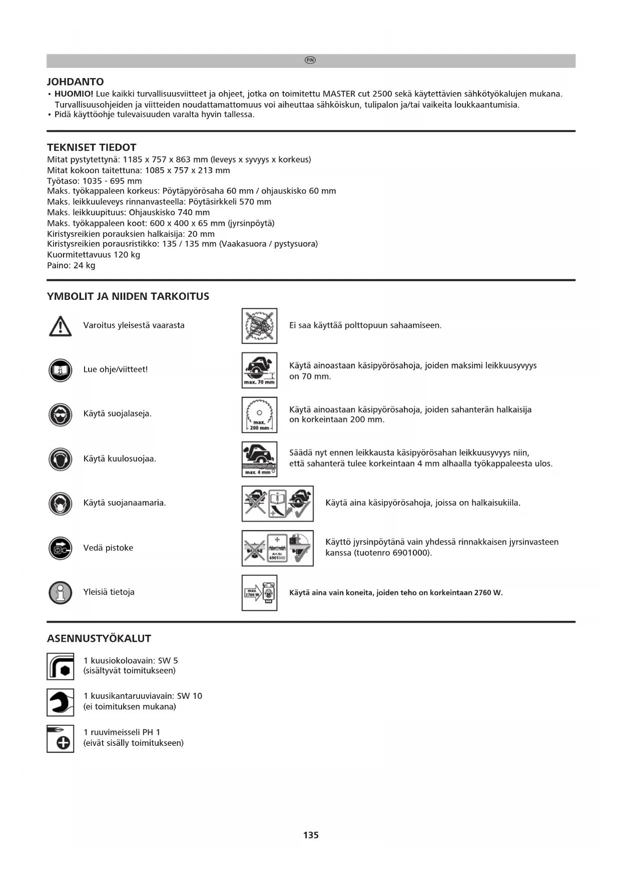 - Pidä käyttöohje tulevaisuuden varalta hyvin tallessa. TEKNISET TIEDOT Mitat pystytettynä: 1185 x 757 x 863 mm (leveys x syvyys x korkeus) Mitat kokoon taitettuna: 1085 x 757 x 213 mm Työtaso: 1035 - 695 mm Maks. työkappaleen korkeus: Pöytäpyörösaha 60 mm / ohjauskisko 60 mm Maks. leikkuuleveys rinnanvasteella: Pöytäsirkkeli 570 mm Maks. leikkuupituus: Ohjauskisko 740 mm Maks. työkappaleen koot: 600 x 400 x 65 mm (jyrsinpöytä) Kiristysreikien porauksien halkaisija: 20 mm Kiristysreikien porausristikko: 135 / 135 mm (Vaakasuora / pystysuora) Kuormitettavuus 120 kg Paino: 24 kg