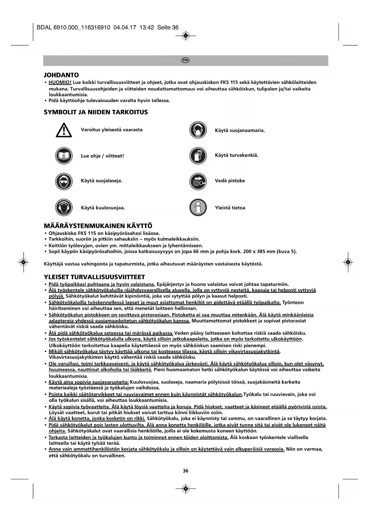 Varoitus yleisestä vaarasta Lue ohje / viitteet! Käytä suojalaseja. Käytä kuulosuojaa. Vedä pistoke Yleistä tietoa Käytä suojanaamaria. Käytä turvakenkiä. BDAL 6910.000_116316910 04.04.17 13:42 Seite 36• Vedä pistoke irti pistorasiasta ja/tai akkulohko sähkötyökaluista, ennen kuin aloitat tehdä laitteeseen asetuksia tai aiot vaihtaa lisätarvikkeita. Sähkötyökalujen tahaton käynnistys voi aiheuttaa tapaturmia.