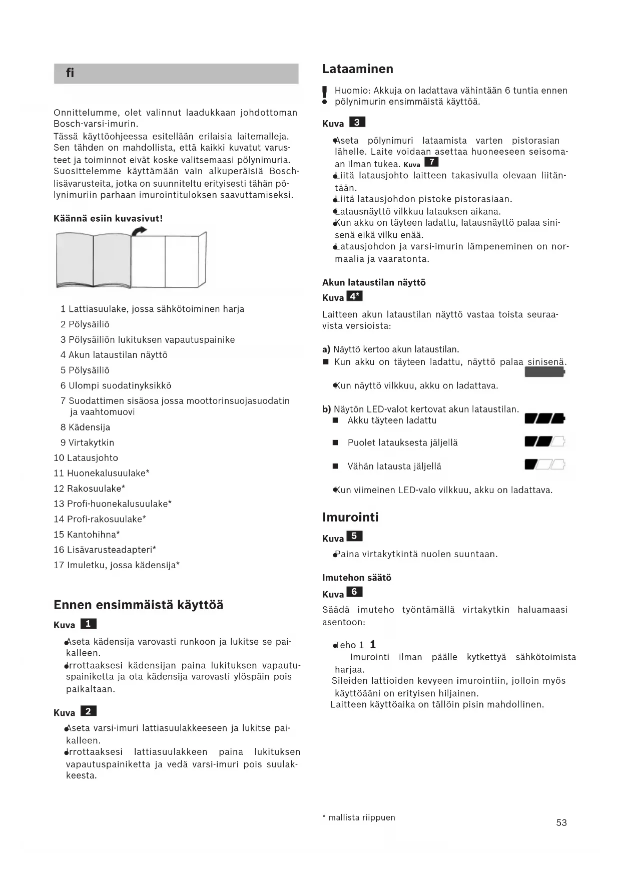 Onnittelumme, olet valinnut laadukkaan johdottoman Bosch-varsi-imurin. Tässä käyttöohjeessa esitellään erilaisia laitemalleja. Sen tähden on mahdollista, että kaikki kuvatut varus- teet ja toiminnot eivät koske valitsemaasi pölynimuria. Suosittelemme käyttämään vain alkuperäisiä Bosch- lisävarusteita, jotka on suunniteltu erityisesti tähän pö- lynimuriin parhaan imurointituloksen saavuttamiseksi. Käännä esiin kuvasivut! 1 Lattiasuulake, jossa sähkötoiminen harja 2 Pölysäiliö 3 Pölysäiliön lukituksen vapautuspainike 4 Akun lataustilan näyttö 5 Pölysäiliö 6 Ulompi suodatinyksikkö 7 Suodattimen sisäosa jossa moottorinsuojasuodatin ja vaahtomuovi 8 Kädensija 9 Virtakytkin 10 Latausjohto 11 Huonekalusuulake* 12 Rakosuulake* 13 Profi-huonekalusuulake* 14 Profi-rakosuulake* 15 Kantohihna* 16 Lisävarusteadapteri* 17 Imuletku, jossa kädensija* Ennen ensimmäistä käyttöä Kuva