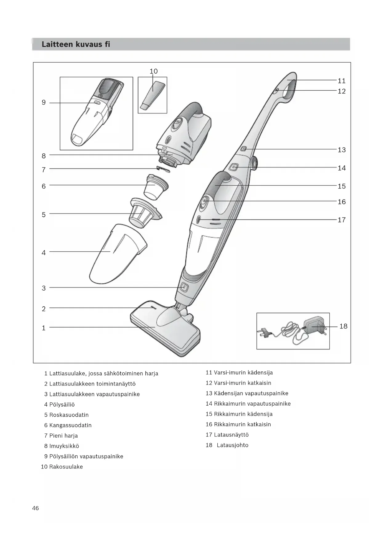 1 Lattiasuulake, jossa sähkötoiminen harja 2 Lattiasuulakkeen toimintanäyttö 3 Lattiasuulakkeen vapautuspainike 4 Pölysäiliö 5 Roskasuodatin 6 Kangassuodatin 7 Pieni harja 8 Imuyksikkö 9 Pölysäiliön vapautuspainike 10 Rakosuulake 11 Varsi-imurin kädensija 12 Varsi-imurin katkaisin 13 Kädensijan vapautuspainike 14 Rikkaimurin vapautuspainike 15 Rikkaimurin kädensija 16 Rikkaimurin katkaisin 17 Latausnäyttö 18 Latauslaite 19 Latauslaitteen jalusta 20 Latausjohto Latausjohto Laitteen kuvaus fi47