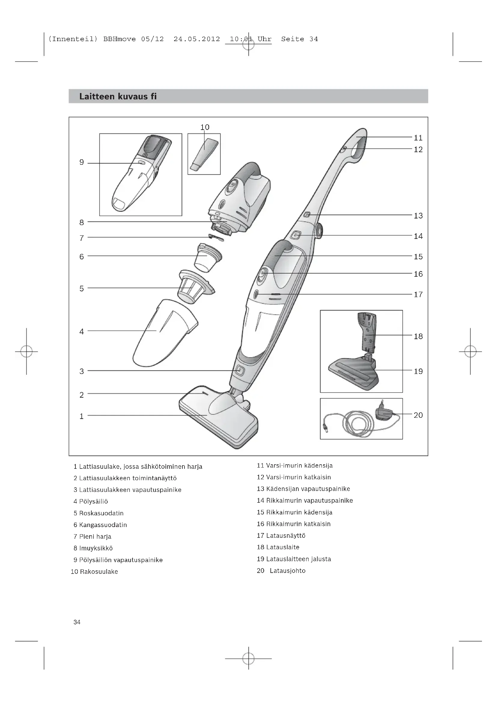 (Innenteil) BBHmove 05/12 24.05.2012 10:01 Uhr Seite 3334 Laitteen kuvaus fi 1 Lattiasuulake, jossa sähkötoiminen harja 2 Lattiasuulakkeen toimintanäyttö 3 Lattiasuulakkeen vapautuspainike 4 Pölysäiliö 5 Roskasuodatin 6 Kangassuodatin 7 Pieni harja 8 Imuyksikkö 9 Pölysäiliön vapautuspainike 10 Rakosuulake 11 Varsi-imurin kädensija 12 Varsi-imurin katkaisin 13 Kädensijan vapautuspainike 14 Rikkaimurin vapautuspainike 15 Rikkaimurin kädensija 16 Rikkaimurin katkaisin 17 Latausnäyttö 18 Latauslaite 19 Latauslaitteen jalusta 20 Latausjohto