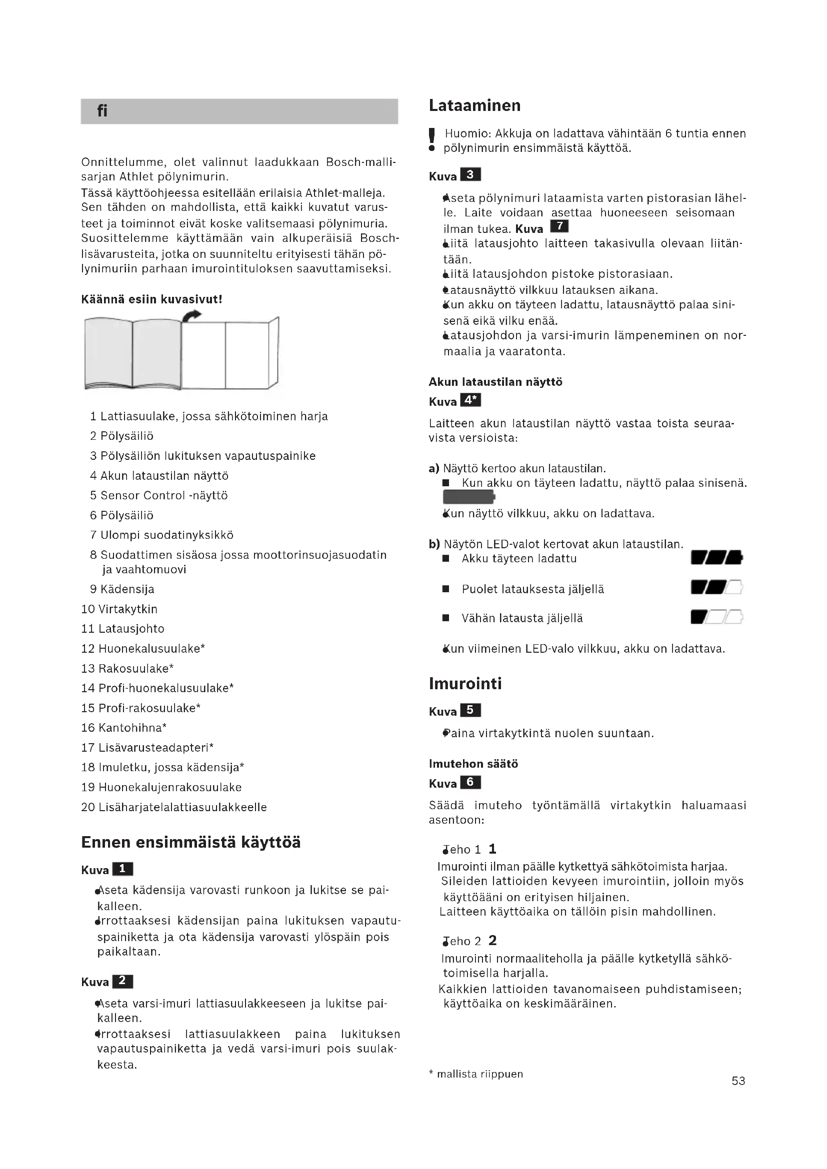 Tässä käyttoöhjeessa esitelläan erilaisia Athlet-malleja. Sen tähden on mahdollista, etta kaikki kuvatut varusteet ja toiminnot eivat koske valitsemaasi polynimuria. Suosittelemme käyttemaan vain alkuperäisia Boschlisāvarusteita, jotka on suunniltulu erityisesti tahan polynimuriin parhaan imuroointituloksen saavuttamiseksi.