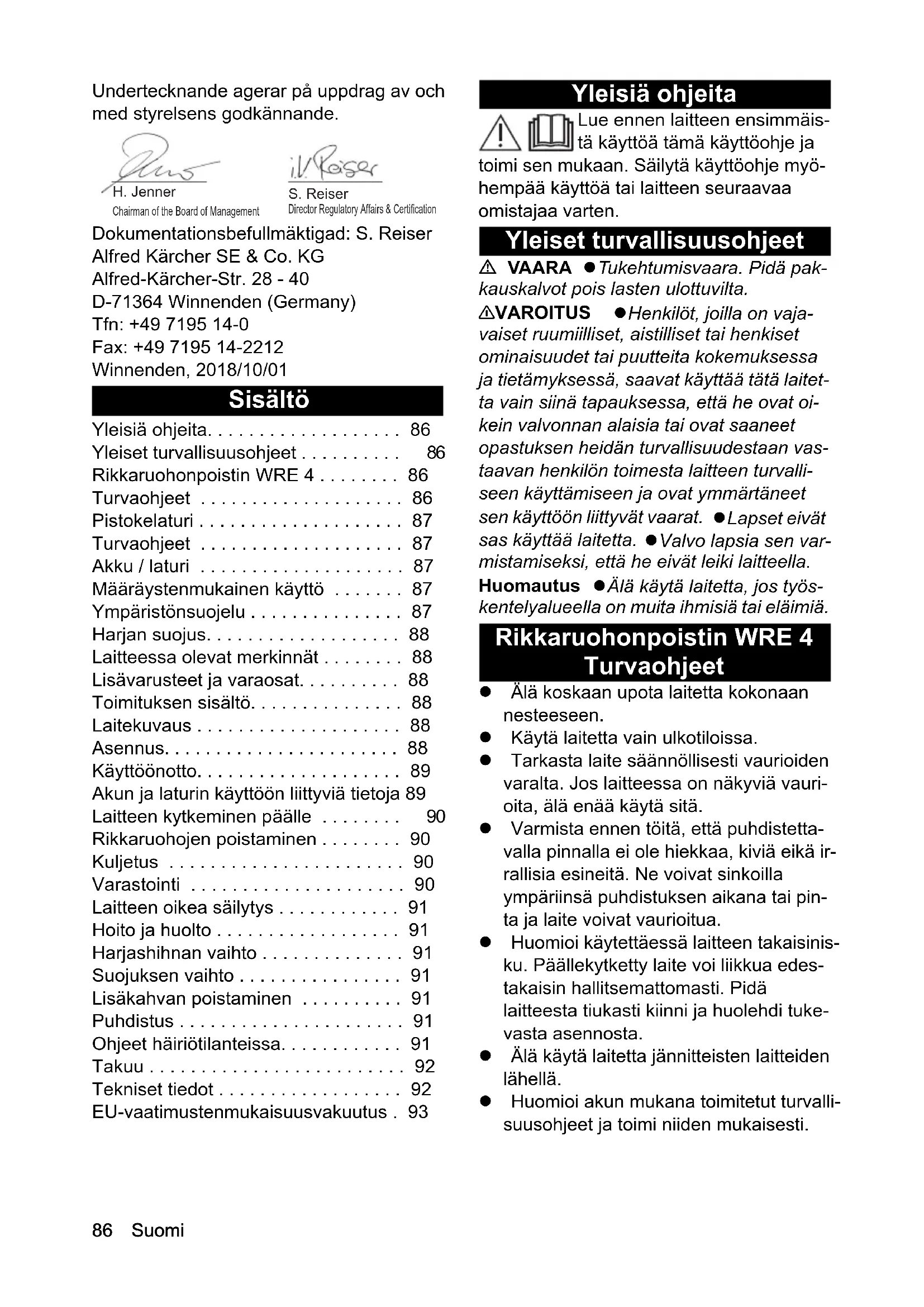 - dB(A)87 87 WRE4 Battery WRE 4 Battery Set86 Suomi Undertecknande agerar på uppdrag av och med styrelsens godkännande. Dokumentationsbefullmäktigad: S. Reiser Alfred Kärcher SE & Co. KG Alfred-Kärcher-Str. 28 - 40 D-71364 Winnenden (Germany) Tfn: +49 7195 14-0 Fax: +49 7195 14-2212 Winnenden, 2018/10/01 Sisältö Yleisiä ohjeita Lue ennen laitteen ensimmäis- tä käyttöä tämä käyttöohje ja toimi sen mukaan. Säilytä käyttöohje myö- hempää käyttöä tai laitteen seuraavaa omistajaa varten. Yleiset turvallisuusohjeet VAARA ●Tukehtumisvaara. Pidä pak- kauskalvot pois lasten ulottuvilta. 몇 VAROITUS ●Henkilöt, joilla on vaja- vaiset ruumiilliset, aistilliset tai henkiset ominaisuudet tai puutteita kokemuksessa ja tietämyksessä, saavat käyttää tätä laitet- ta vain siinä tapauksessa, että he ovat oi- kein valvonnan alaisia tai ovat saaneet opastuksen heidän turvallisuudestaan vas- taavan henkilön toimesta laitteen turvalli- seen käyttämiseen ja ovat ymmärtäneet sen käyttöön liittyvät vaarat. ●Lapset eivät sas käyttää laitetta. ●Valvo lapsia sen var- mistamiseksi, että he eivät leiki laitteella. Huomautus ●Älä käytä laitetta, jos työs- kentelyalueella on muita ihmisiä tai eläimiä. Rikkaruohonpoistin WRE 4 Turvaohjeet Älä koskaan upota laitetta kokonaan nesteeseen. Käytä laitetta vain ulkotiloissa. Tarkasta laite säännöllisesti vaurioiden varalta. Jos laitteessa on näkyviä vauri- oita, älä enää käytä sitä. Varmista ennen töitä, että puhdistetta- valla pinnalla ei ole hiekkaa, kiviä eikä ir- rallisia esineitä. Ne voivat sinkoilla ympäriinsä puhdistuksen aikana tai pin- ta ja laite voivat vaurioitua. Huomioi käytettäessä laitteen takaisinis- ku. Päällekytketty laite voi liikkua edes- takaisin hallitsemattomasti. Pidä laitteesta tiukasti kiinni ja huolehdi tuke- vasta asennosta. Älä käytä laitetta jännitteisten laitteiden lähellä. Huomioi akun mukana toimitetut turvalli- suusohjeet ja toimi niiden mukaisesti. Yleisiä ohjeita p. 86
