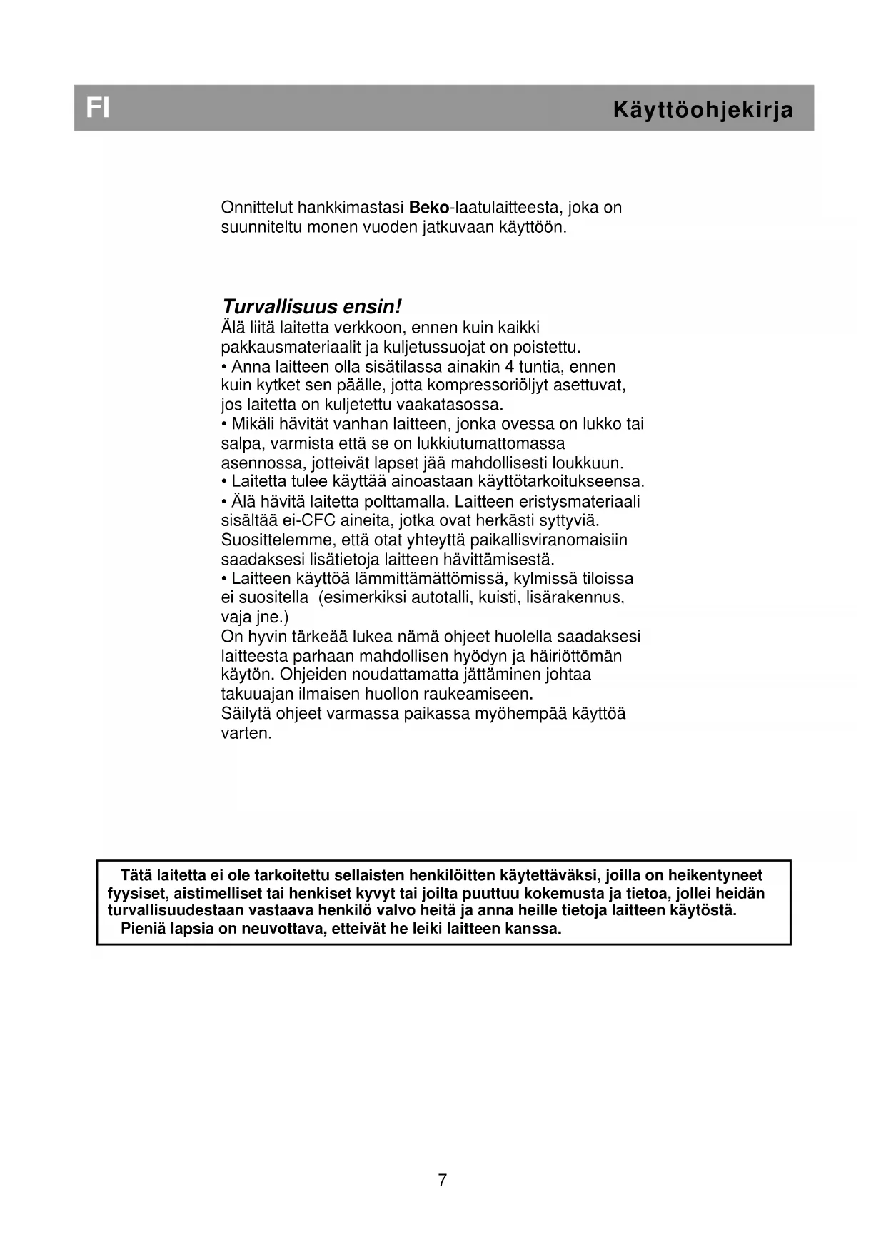 Tätä laitetta ei ole tarkoitettu sellaisten henkilöitten käytettäväksi, joilla on heikentyneet fyysiset, aistimelliset tai henkiset kyvyt tai joilta puuttuu kokemusta ja tietoa, jollei heidän turvallisuudestaan vastaava henkilö valvo heitä ja anna heille tietoja laitteen käytöstä. Pieniä lapsia on neuvottava, etteivät he leiki laitteen kanssa.FI Käyttöohjekirja Sähkötekniset vaatimukset Ennen kuin laitat pistokkeen pistorasiaan, varmista, että laitteen sisällä olevan luokituskilven jännite ja taajuus vastaavat saatavilla olevaa verkkovirtaa. Suosittelemme laitteen liittämistä verkkojännitesyöttöön helposti saatavilla olevan oikealla tavalla kytketyn ja sulakkeella varustetun pistorasian kautta. Varoitus! Laite täytyy maadoittaa. Sähkölaitteen korjauksia saa suorittaa vain valtuutettu sähkömies. Valtuuttamattoman henkilön tekemät väärät korjaukset saattavat aiheuttaa vakavia seurauksia laitteen käyttäjälle. HUOMIO! Tämä laite käyttää R600a-jäähdytysainetta, joka on ympäristöystävällinen mutta syttyvä kaasu. Laitteen kuljetuksen ja asennuksen aikana on varottava vahingoittamasta jäähdytysjärjestelmää. Jos jäähdytysjärjestelmä vaurioituu ja järjestelmästä vuotaa kaasua, pidä laite kaukana avotulesta ja tuuleta tilaa jonkin aikaa. VAROITUS - Älä käytä mekaanisia tai muita keinoja, joita valmistaja ei suosittele, sulattamisprosessin nopeuttamiseen. VAROITUS -Älä vaurioita jäähdytysvirtapiiriä. VAROITUS -Älä käytä sähkölaitteita laitteen ruokalokeroissa, jolleivät ne ole valmistajan suosittelemaa tyyppiä. VAROITUS -Jollei näitä ohjeita noudateta, seurauksena voi olla henkilövahinko tai materiaalinen vahinko. Kuljetusohjeet