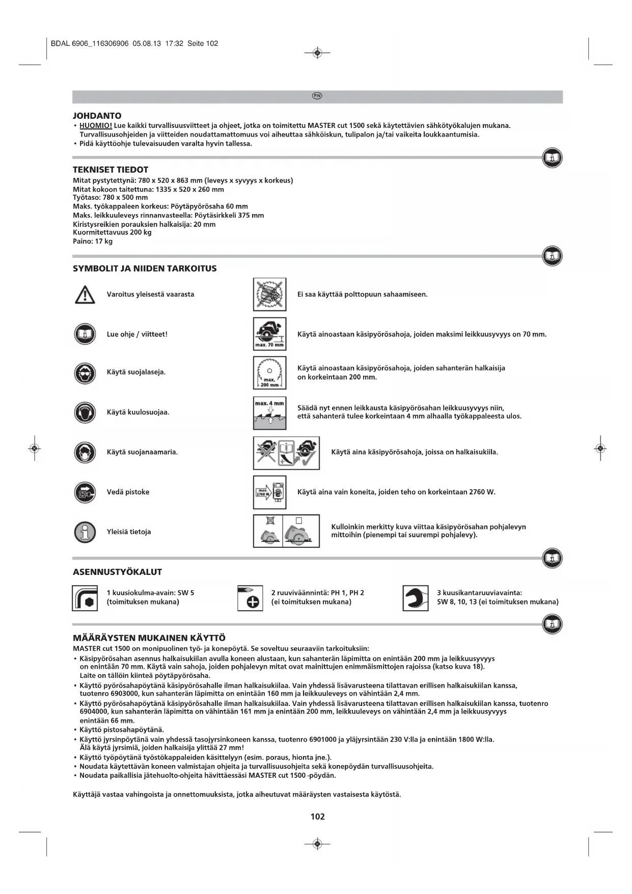 - Noudata paikallisia jätehuolto-ohjeita hävittäessäsi MASTER cut 1500 -pöydän. Käyttäjä vastaa vahingoista ja onnettomuuksista, jotka aiheutuvat määräysten vastaisesta käytöstä. Käytä aina vain koneita, joiden teho on korkeintaan 2760 W. BDAL 6906_116306906 05.08.13 17:32 Seite 102103