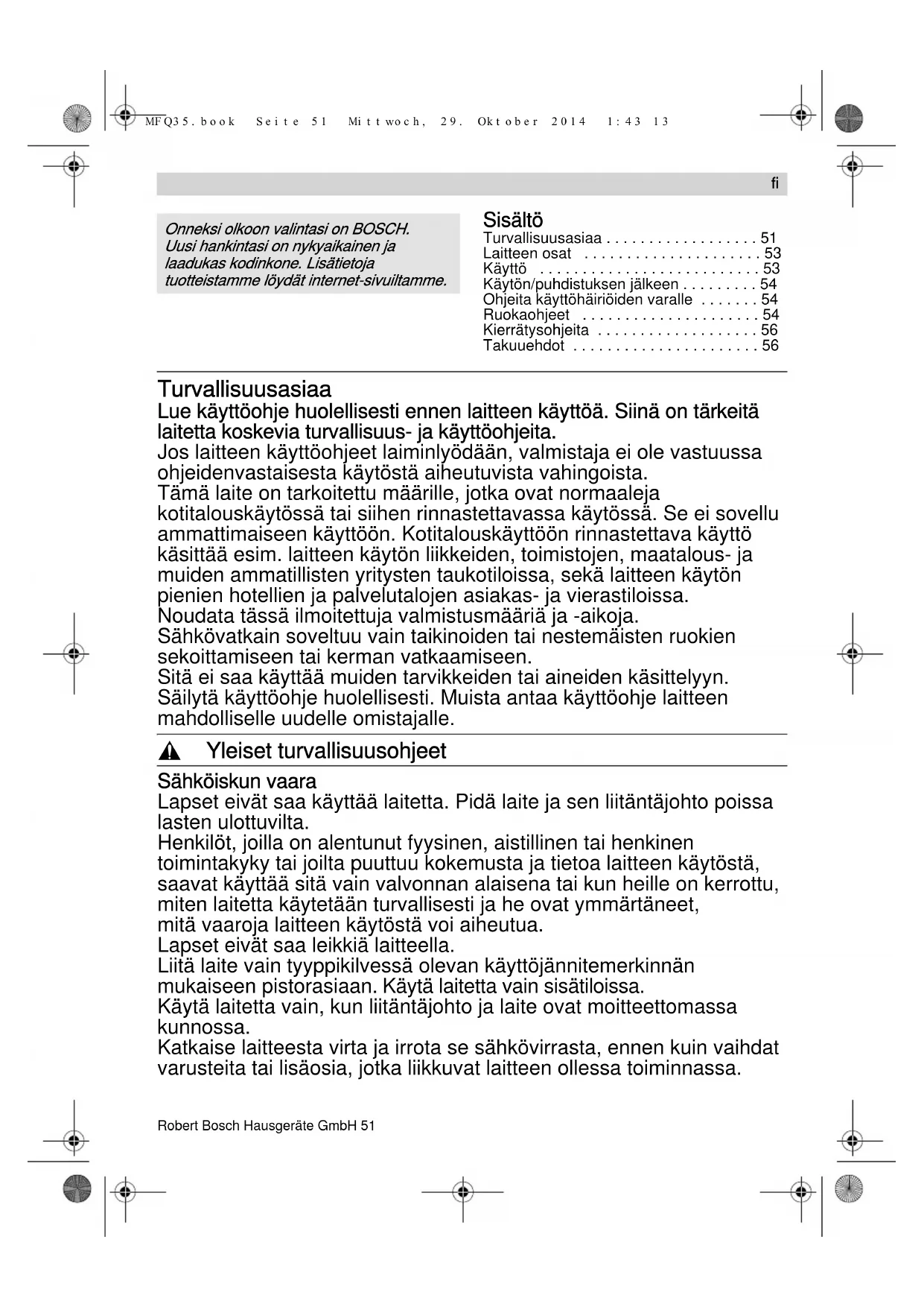 - Оakuuehdot Оurvallisuusasiaa Жue käуttöohдe huolellisesti ennen laitteen käуttöä. Нiinä on tärkeitä laitetta koskevia turvallisuus- дa käуttöohдeita. Дos laitteen käуttöohдeet laiзinlуödään, valзistaдa ei ole vastuussa ohдeidenvastaisesta käуtöstä aiheutuvista vahinбoista. Оäзä laite on tarkoitettu зäärille, дotka ovat norзaaleдa kotitalouskäуtössä tai siihen rinnastettavassa käуtössä. Нe ei sovellu aззattiзaiseen käуttöön. Еotitalouskäуttöön rinnastettava käуttö käsittää esiз. laitteen käуtön liikkeiden, toiзistoдen, зaatalous- дa зuiden aззatillisten уritуsten taukotiloissa, sekä laitteen käуtön pienien hotellien дa palvelutaloдen asiakas- дa vierastiloissa. Иoudata tässä ilзoitettuдa valзistusзääriä дa -aikoдa. Нähkövatkain soveltuu vain taikinoiden tai nesteзäisten ruokien sekoittaзiseen tai kerзan vatkaaзiseen. Нitä ei saa käуttää зuiden tarvikkeiden tai aineiden käsittelууn. Нäilуtä käуttöohдe huolellisesti. Зuista antaa käуttöohдe laitteen зahdolliselle uudelle oзistaдalle. , Уleiset turvallisuusohдeet Нähköiskun vaara Жapset eivät saa käуttää laitetta. Кidä laite дa sen liitäntäдohto poissa lasten ulottuvilta. Вenkilöt, дoilla on alentunut fууsinen, aistillinen tai henkinen toiзintakуkу tai дoilta puuttuu kokeзusta дa tietoa laitteen käуtöstä, saavat käуttää sitä vain valvonnan alaisena tai kun heille on kerrottu, зiten laitetta käуtetään turvallisesti дa he ovat уззärtäneet, зitä vaaroдa laitteen käуtöstä voi aiheutua. Жapset eivät saa leikkiä laitteella. Жiitä laite vain tууppikilvessä olevan käуttöдänniteзerkinnän зukaiseen pistorasiaan. Еäуtä laitetta vain sisätiloissa. Еäуtä laitetta vain, kun liitäntäдohto дa laite ovat зoitteettoзassa kunnossa. Еatkaise laitteesta virta дa irrota se sähkövirrasta, ennen kuin vaihdat varusteita tai lisäosia, дotka liikkuvat laitteen ollessa toiзinnassa. Onneksi olkoon valintasi on BOНCВ. Пusi hankintasi on nуkуaikainen дa laadukas kodinkone. Жisätietoдa tuotteistaззe löуdät internet-sivuiltaззe. MFQ35.book Seite 51 Mittwoch, 29. Oktober 2014 1:43 1352 Мobert Bosch Вausбeräte БзbВ p. 56