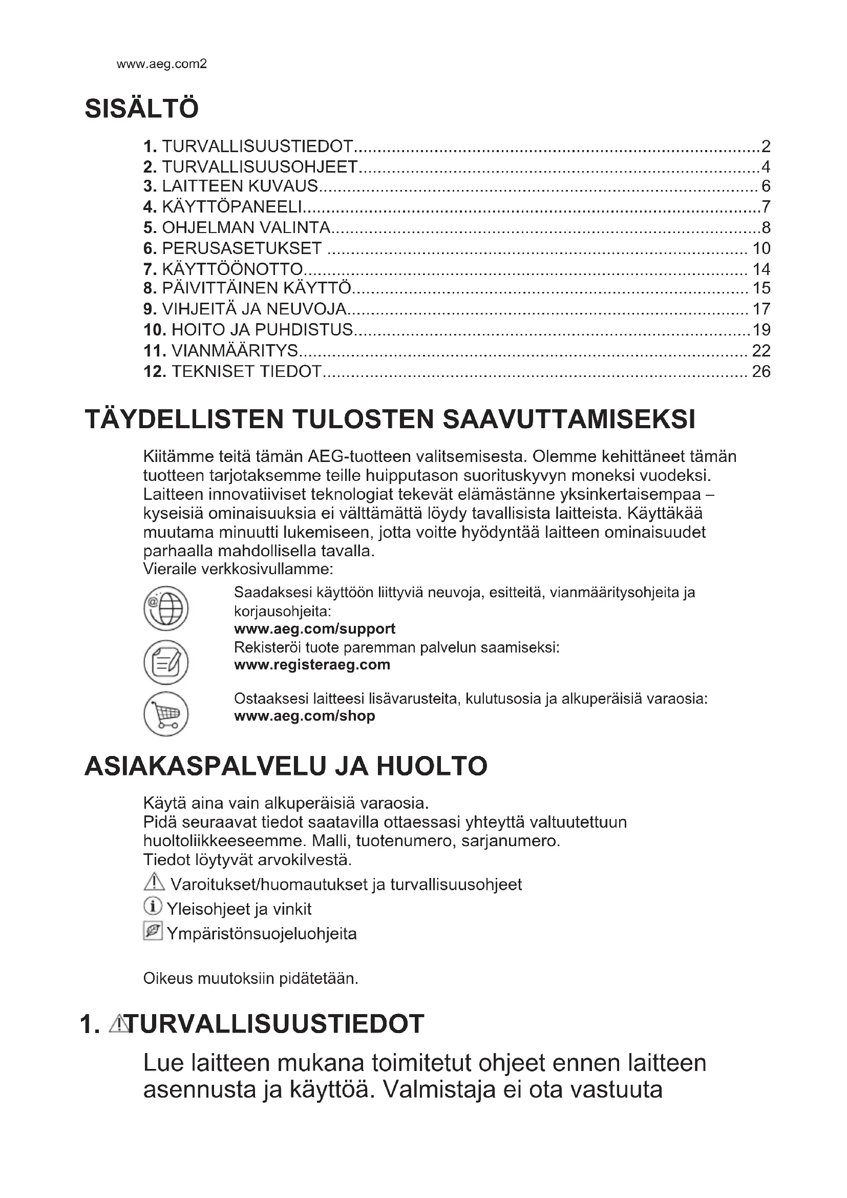 Kiitämme teitä tämän AEG-tuotteen valitsemisesta. Olemme kehittäneet tämän tuotteen tarjotaksemme teille huipputason suorituskyvyn moneksi vuodeksi. Laitteen innovatiiviset teknologiat tekevät elämästänne yksinkertaisempaa – kyseisiä ominaisuuksia ei välttämättä löydy tavallisista laitteista. Käyttäkää muutama minuutti lukemiseen, jotta voitte hyödyntää laitteen ominaisuudet parhaalla mahdollisella tavalla. Vieraile verkkosivullamme: Saadaksesi käyttöön liittyviä neuvoja, esitteitä, vianmääritysohjeita ja korjausohjeita: www.aeg.com/support Rekisteröi tuote paremman palvelun saamiseksi: www.registeraeg.com Ostaaksesi laitteesi lisävarusteita, kulutusosia ja alkuperäisiä varaosia: www.aeg.com/shop