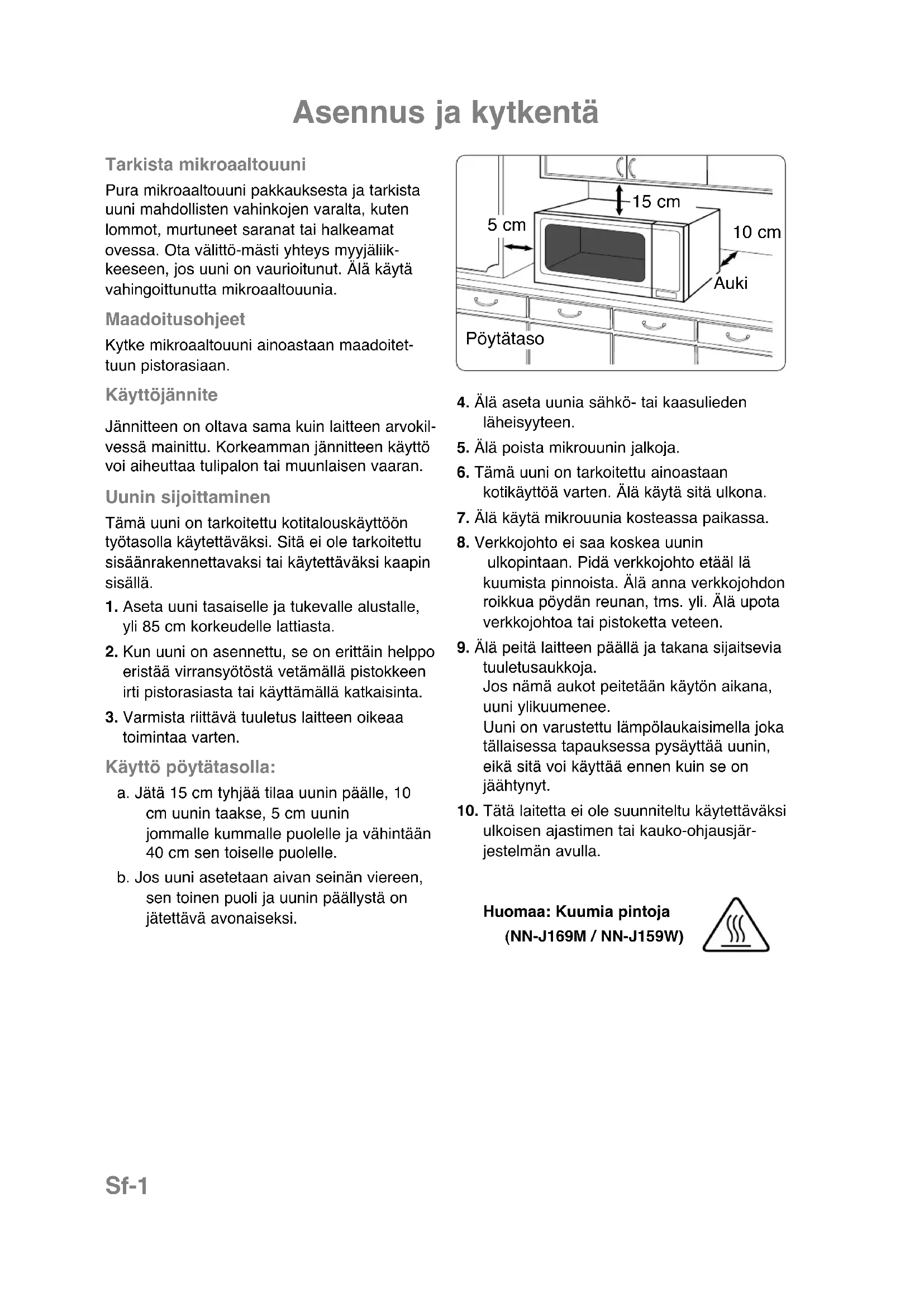ulkoisen ajastimen tai kauko-ohjausjär- jestelmän avulla. Pöytätaso 5 cm 10 cm Auki 15 cm Huomaa: Kuumia pintoja (NN-J169M / NN-J159W)Sf-2