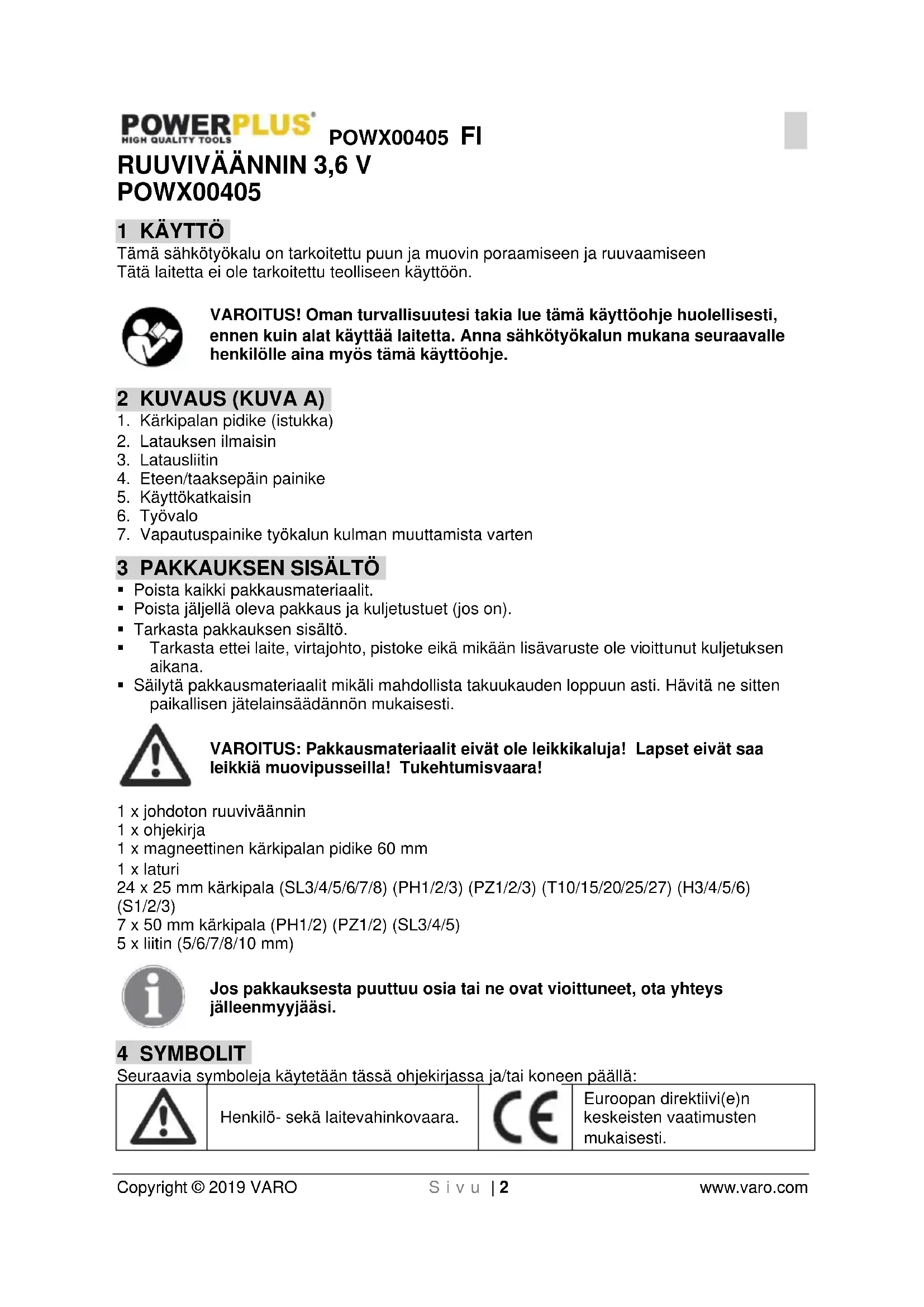 Euroopan direktiivi(e)n keskeisten vaatimusten mukaisesti.POWX00405 FI Copyright © 2019 VARO S i v u | 3 www.varo.com