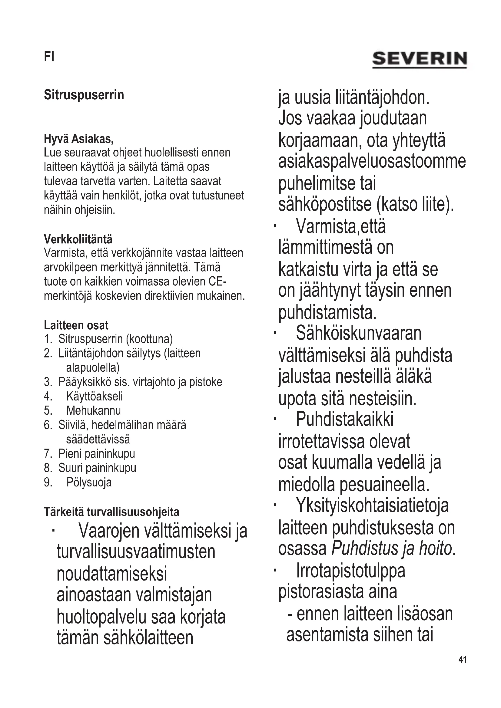 käyttöön liittyvät vaarat ja noudattaa tarvittavia turvatoimia. ∙ Lasten ei saa antaa leikkiä laitteella. ∙ Varoitus: Pidä lapset poissa pakkausmateriaalien luota potentiaalisen vaaratilanteen esim. tukehtumisvaaran vuoksi. ∙ Ennen laitteen käyttöönottoa tarkasta laite ja virtajohto sekä kaikki mahdolliset lisäosat perusteellisesti vikojen tai vaurioiden varalta. Jos laite on esimerkiksi pudonnut kovalle pinnalle tai liitäntäjohdon vetämiseen on käytetty liikaa voimaa, laitetta ei saa enää käyttää: näkymättömätkin vauriot voivat aiheuttaa laitetta käytettäessä vaaratilanteita. ∙ Älä anna laitteen tai liitäntäjohdon koskettaa kuumia pintoja tai joutua kosketuksiin lämmönlähteiden kanssa. ∙ Kun irrotat pistotulpan pistorasiasta, älävedäliitäntäjohdosta;tartuaina pistotulppaan. Älä jätä liitäntäjohtoa riippumaan vapaana. ∙ Älä käytä laitetta muiden kuin valmistajan toimittamien lisäosien kanssa. ∙ Valmistaja ei ole vastuussa mahdollisista vaurioista, jos ne johtuvat laitteen väärinkäytöstä tai käyttöohjeiden laiminlyömisestä. Ennen ensimmäistä käyttöä Puhdista laite osassa Puhdistus ja hoito annettujen ohjeiden mukaisesti ennen käyttöä. Liitäntäjohdon säilytys Jalustassa on liitäntäjohdolle säilytystila. Kelaa johto auki haluttuun pituuteen ennen käyttöä. Kelaa johto käytön jälkeen kokoon. Käyttö ∙ Kiinnitä käyttöyksikkö käyttöakseliin. ∙ Kiinnitä mehukannu käyttöakseliin. Käännä mehukannua vastapäivään, kunnes kuulet sen lukkiutuvan paikalleen. ∙ Asenna pieni paininkupu siivilän päälle painamalla sitä alaspäin, kunnes kuulet sen lukkiutuvan paikalleen. ∙ Aseta siivilä ja paininkupu mehukannun päälle. ∙ Kun mehustat suurikokokoisia hedelmiä kuten appelsiineja, pienen paininkuvun päällevoikiinnittääsuurenpaininkuvun; varmista, että suuressa paininkuvussa olevat urat sopivat pienessä paininkuvussa oleviin ulokkeisiin. Vinkki Mehun hedelmälihan määrää voidaan säätää avaamalla tai sulkemalla siivilän: =siiviläauki→enemmän hedelmälihaa =siiviläkiinni→vähemmän hedelmälihaa ∙ Laita pistotulppa sopivaan pistorasiaan. ∙ Halkaise hedelmä ja työnnä puolikas kevyesti kupuun halkaistu puoli ylöspäin.44 104 x 142 mm ∙ Käyttöakseli alkaa pyöriä automaattisesti, kun kupua painetaan alas. Virta katkeaa, kun kupua ei paineta. ∙ Mehun puristamiseksi paremmin moottori voi pyöriä kumpaankin suuntaan ja myös vaihtaa suuntaa käytön aikana. ∙ Suuria hedelmämääriä mehustettaessa on siivilä tyhjennettävä tarvittaessa. ∙ Ota aina pistotulppa pois pistorasiasta ennen mehun kaatamista pois. ∙ Puristetun mehun kaatamiseksi ulos siivilä ja paininkupu irrotetaan mehukannusta. Sen jälkeen mehuastia irrotetaan jalustalta kääntämällä kannua myötäpäivään. ∙ Säilytä mehua sopivassa astiassa. Puhdistus ja hoito ∙ Irrota pistotulppa pistorasiasta ennen laitteen puhdistamista. ∙ Sähköiskun vaaran välttämiseksi älä puhdista laitetta nesteillä äläkä upota sitä nesteisiin. ∙ Älä käytä hankausaineita, vahvoja puhdistusaineita tai kovia harjoja laitteen puhdistukseen. ∙ Jalusta pyyhitään kosteahkolla, nukkaamattomalla rievulla. ∙ Lisävarusteet on puhdistettava välittömästi käytön jälkeen kuumalla vedellä ja miedolla pesuaineella. ∙ Kun laite ei ole vakituisessa käytössä, kiinnitä siivilä, paininkuvut ja pölysuoja laitteeseen puhdistuksen jälkeen. Jätehuolto Tällä symbolilla merkityt laitteet täytyy hävittää kotitalousjätteestä erillään, sillä ne sisältävät arvokkaita kierrätyskelpoisia materiaaleja. Asianmukaisella hävittämisellä suojellaan ympäristöä ja ihmisterveyttä. Saat aiheesta lisätietoa paikallisilta viranomaisilta tai jälleenmyyjiltä. Takuu Laitteelle myönnetään 2 vuoden takuu, joka koskee valmistus- ja ainevikoja, ostopäivästä lukien yksilöityä ostokuittia vastaan yleisten Suomessa kulloinkin alalla voimassa olevien takuuehtojen mukaan. Mikäli laitetta käytetään väärin, käyttöohjeen vastaisesti tai huolimattomasti, vastuu syntyvistä esine- ja henkilövahingoista lankeaa laitteen käyttäjälle. Tämä takuu ei vaikuta lakimääräisiin oikeuksiin eikä mihinkään muihin kansallisen lainsäädännön säätämiin tuotteiden ostoa koskeviin laillisiin kuluttajaoikeuksiin, joita tuotteen hankkijalla on. Valmistuttaja: Severin Elektrogeräte GmbH, Saksa Maahantuoja: AV-Komponentti Oy (Puh) 09-8678020 info@avkomponentti. www.avkomponentti.104 x 142 mm