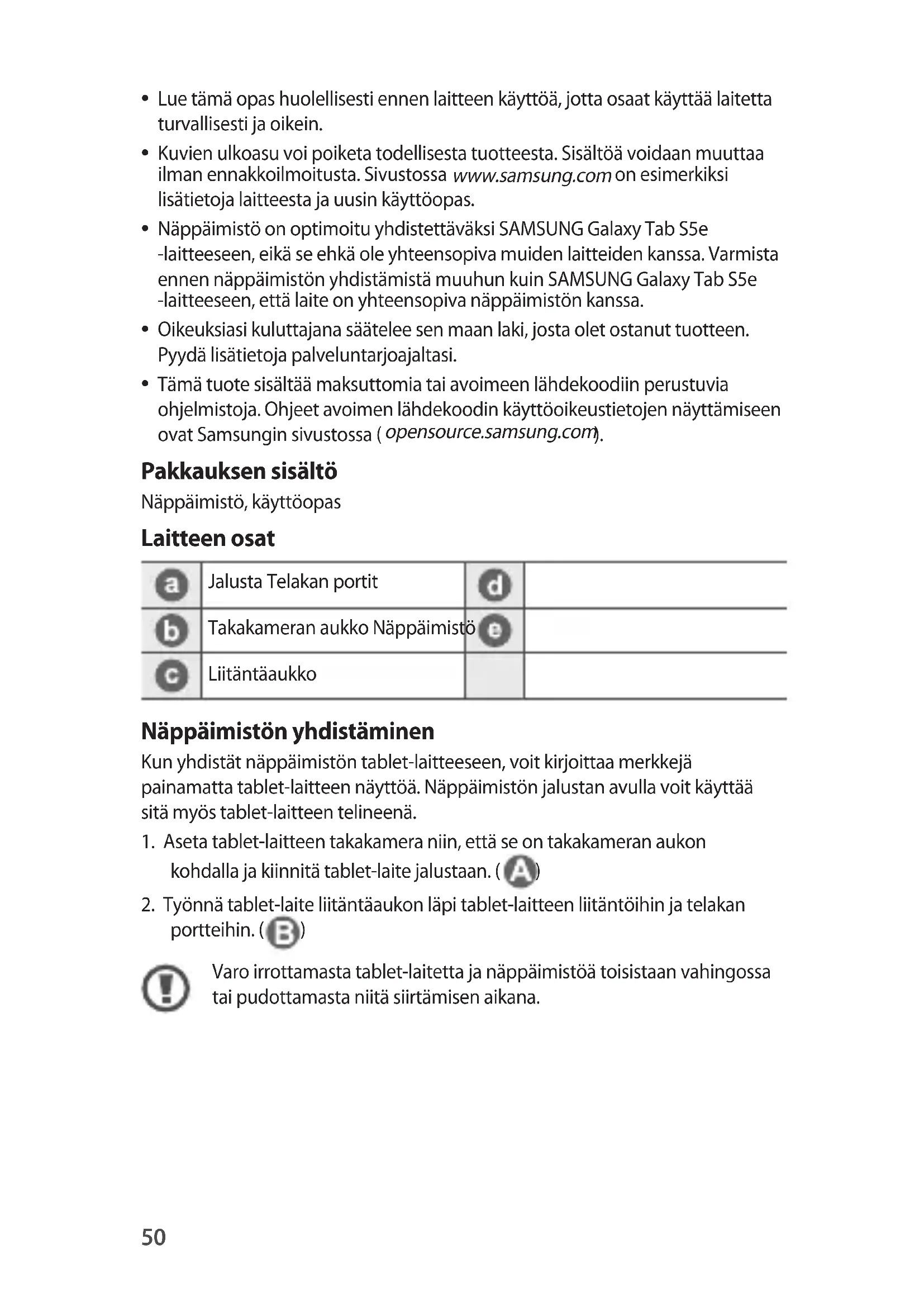 Näppäimistö on optimoitu yhdistettäväksi SAMSUNG Galaxy Tab S5e -laitteeseen, eikä se ehkä ole yhteensopiva muiden laitteiden kanssa. Varmista ennen näppäimistön yhdistämistä muuhun kuin SAMSUNG Galaxy Tab S5e -laitteeseen, että laite on yhteensopiva näppäimistön kanssa.