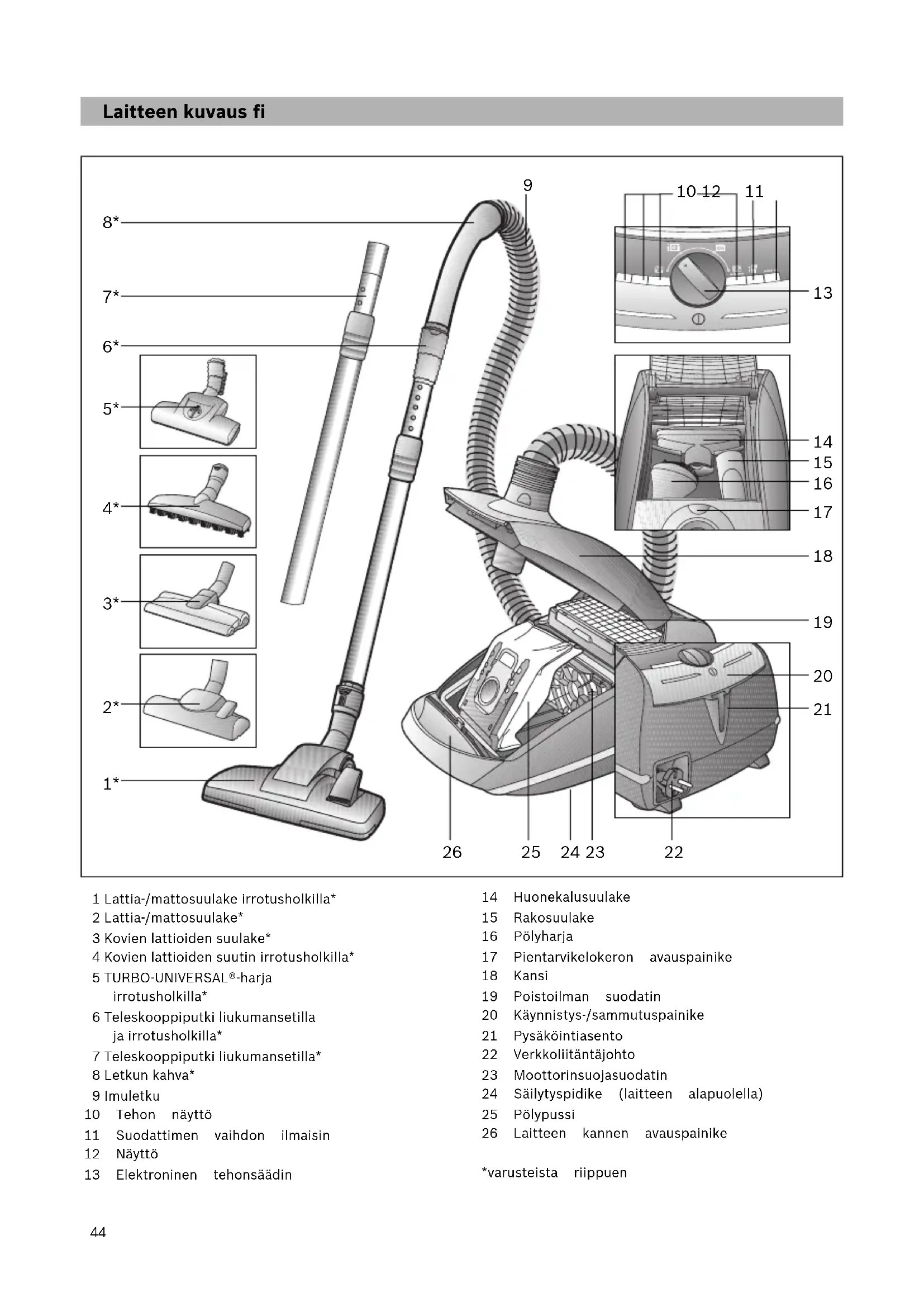 Korkea tehoalue: Karkeiden lattiapintojen siivoukseen, kovat lattiat ja erittäin likaiset pinnat. b)Air Power: Runsaaseen likaantumiseen ja karkeaan likaan. Laite imuroi suurimmalla mahdollisella imuteholla. Kuva Lattiasuulakkeen säätö: a)Mattojen ja kokolattiamattojen imurointiin => b)Kovien lattioiden imurointiin => Huomio! Lattiasuulakkeet kuluvat jonkin verran kovien lattioiden ominaisuuksista riippuen (esimerkiksi karkeapintaiset, talonpoikaistyyliset kaakelit). Tarkasta sen tähden suulakkeen pohja säännöllisesti. Kuluneet, teräväreunaiset suulakepohjat voivat aiheuttaa vaurioita hellävaraisesti käsiteltäviin lattapintoihin kuten parkettiin tai linoleumiin. Valmistaja ei vastaa mahdollisista kuluneen lattiasuulakkeen aiheuttamista vahingoista. Turboharja Jos laitteessasi on turboharja, saat oheisista käyttöohjeista tietoja ja ohjeita sen käytöstä ja huollosta. Pientarvikkeet, joita et tarvitse, voidaan sijoittaa mukavasti laitteen kannen varustelokeroon. Kuva Kun painat avauspainiketta, varustelokeron kansi avautuu itsestään. Ota haluamasi varuste esiin. Kuva Kun olet ottanut varusteen esiin, sulje varustelokeron kansi ja lukitse se paikalleen.