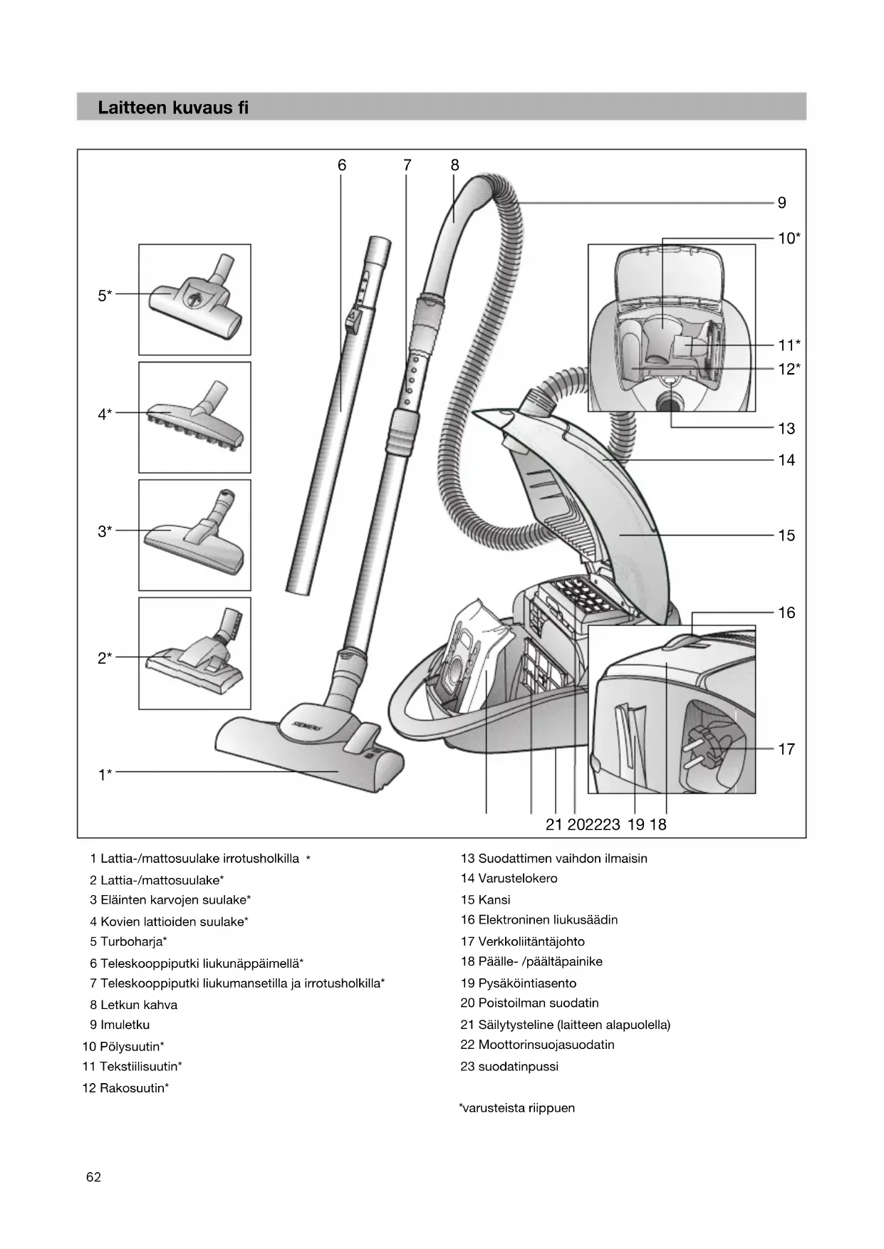 2 Lattia-/mattosuulake* 3 Eläinten karvojen suulake* 4 Kovien lattioiden suulake* 5 Turboharja* 6 Teleskooppiputki liukunäppäimellä* 7 Teleskooppiputki liukumansetilla ja irrotusholkilla* 8 Letkun kahva 9 Imuletku 10 Pölysuutin* 11 Tekstiilisuutin* 12 Rakosuutin* 13 Suodattimen vaihdon ilmaisin 14 Varustelokero 15 Kansi 16 Elektroninen liukusäädin 17 Verkkoliitäntäjohto 18 Päälle- /päältäpainike 19 Pysäköintiasento 20 Poistoilman suodatin 21 Säilytysteline (laitteen alapuolella) 22 Moottorinsuojasuodatin 23 suodatinpussi