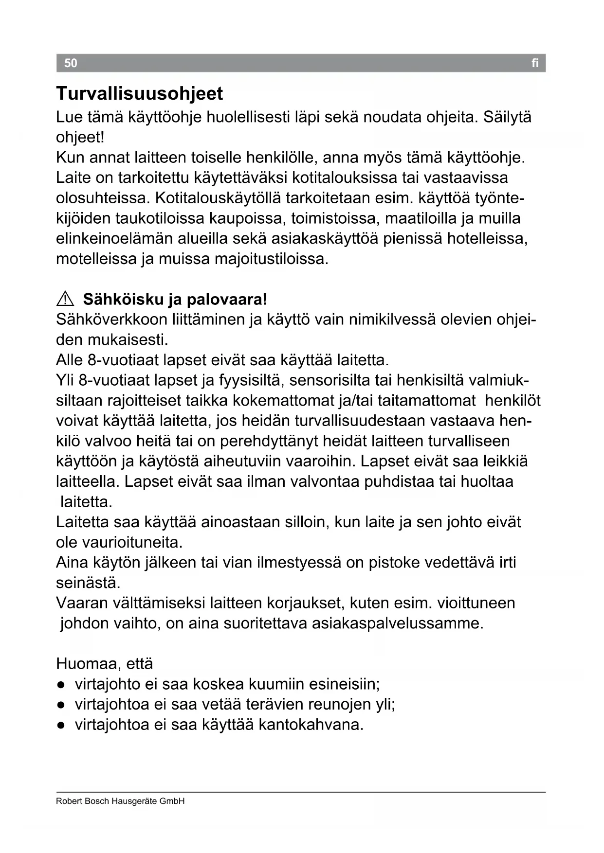 Kaikki ihokontakti on vältettävä. Robert Bosch Hausgeräte GmbH