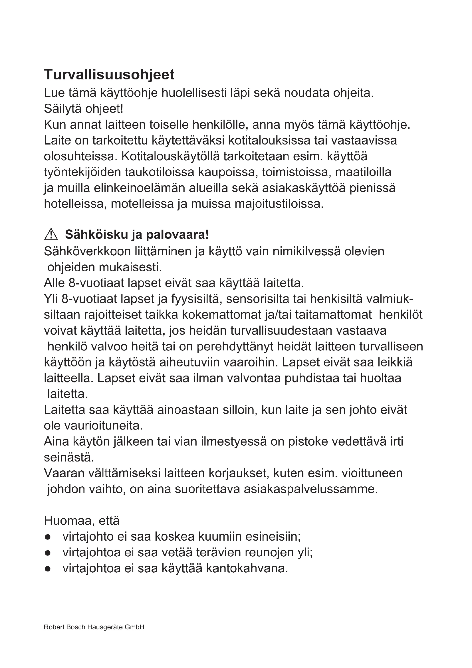Turvallisuusohjeet Luetämäkäyttöohjehuolellisestiläpisekänoudataohjeita. Säilytäohjeet! Kunannatlaitteentoisellehenkilölle,annamyöstämäkäyttöohje. Laiteontarkoitettukäytettäväksikotitalouksissataivastaavissa olosuhteissa.Kotitalouskäytöllätarkoitetaanesim.käyttöä työntekijöidentaukotiloissakaupoissa,toimistoissa,maatiloilla jamuillaelinkeinoelämänalueillasekäasiakaskäyttöäpienissä hotelleissa,motelleissajamuissamajoitustiloissa.