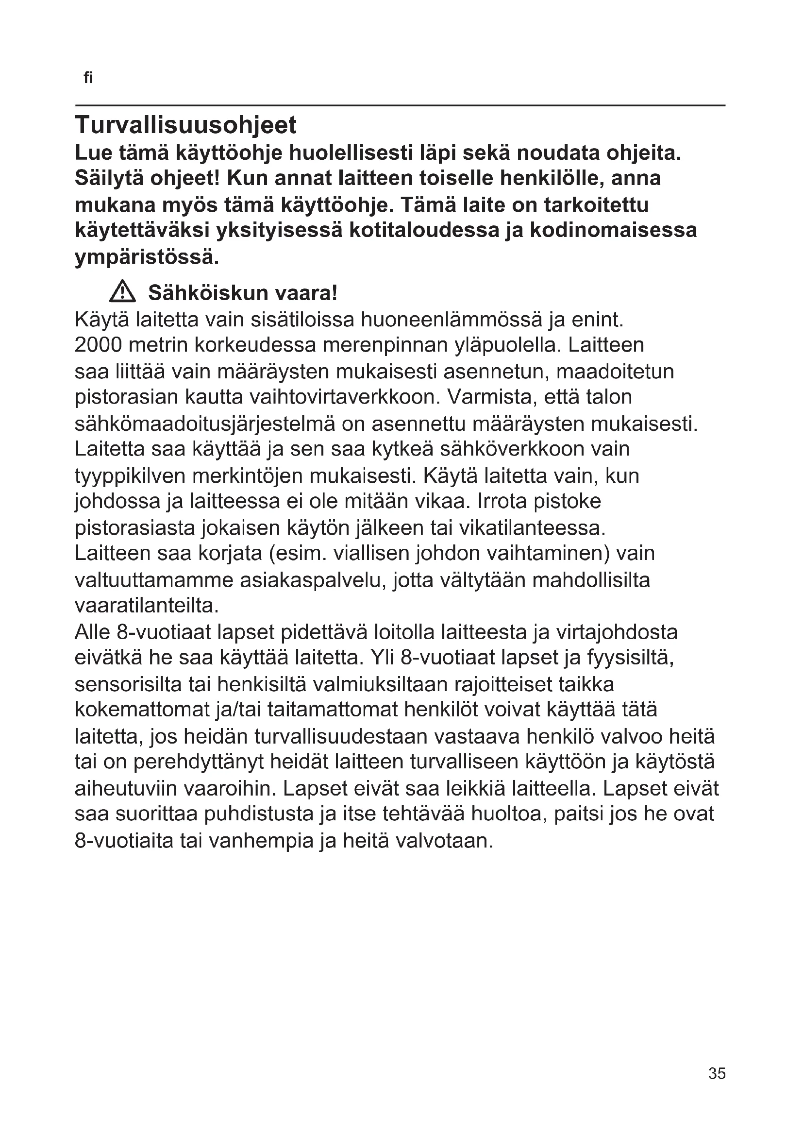 Turvallisuusohjeet Lue tämä käyttöohje huolellisesti läpi sekä noudata ohjeita. Säilytä ohjeet! Kun annat laitteen toiselle henkilölle, anna mukana myös tämä käyttöohje. Tämä laite on tarkoitettu käytettäväksi yksityisessä kotitaloudessa ja kodinomaisessa ympäristössä. W Sähköiskun vaara! Käytä laitetta vain sisätiloissa huoneenlämmössä ja enint. 2000 metrin korkeudessa merenpinnan yläpuolella. Laitteen saa liittää vain määräysten mukaisesti asennetun, maadoitetun pistorasian kautta vaihtovirtaverkkoon. Varmista, että talon sähkömaadoitusjärjestelmä on asennettu määräysten mukaisesti. Laitetta saa käyttää ja sen saa kytkeä sähköverkkoon vain tyyppikilven merkintöjen mukaisesti. Käytä laitetta vain, kun johdossa ja laitteessa ei ole mitään vikaa. Irrota pistoke pistorasiasta jokaisen käytön jälkeen tai vikatilanteessa. Laitteen saa korjata (esim. viallisen johdon vaihtaminen) vain valtuuttamamme asiakaspalvelu, jotta vältytään mahdollisilta vaaratilanteilta. Alle 8-vuotiaat lapset pidettävä loitolla laitteesta ja virtajohdosta eivätkä he saa käyttää laitetta. Yli 8-vuotiaat lapset ja fyysisiltä, sensorisilta tai henkisiltä valmiuksiltaan rajoitteiset taikka kokemattomat ja/tai taitamattomat henkilöt voivat käyttää tätä laitetta, jos heidän turvallisuudestaan vastaava henkilö valvoo heitä tai on perehdyttänyt heidät laitteen turvalliseen käyttöön ja käytöstä aiheutuviin vaaroihin. Lapset eivät saa leikkiä laitteella. Lapset eivät saa suorittaa puhdistusta ja itse tehtävää huoltoa, paitsi jos he ovat 8-vuotiaita tai vanhempia ja heitä valvotaan.36