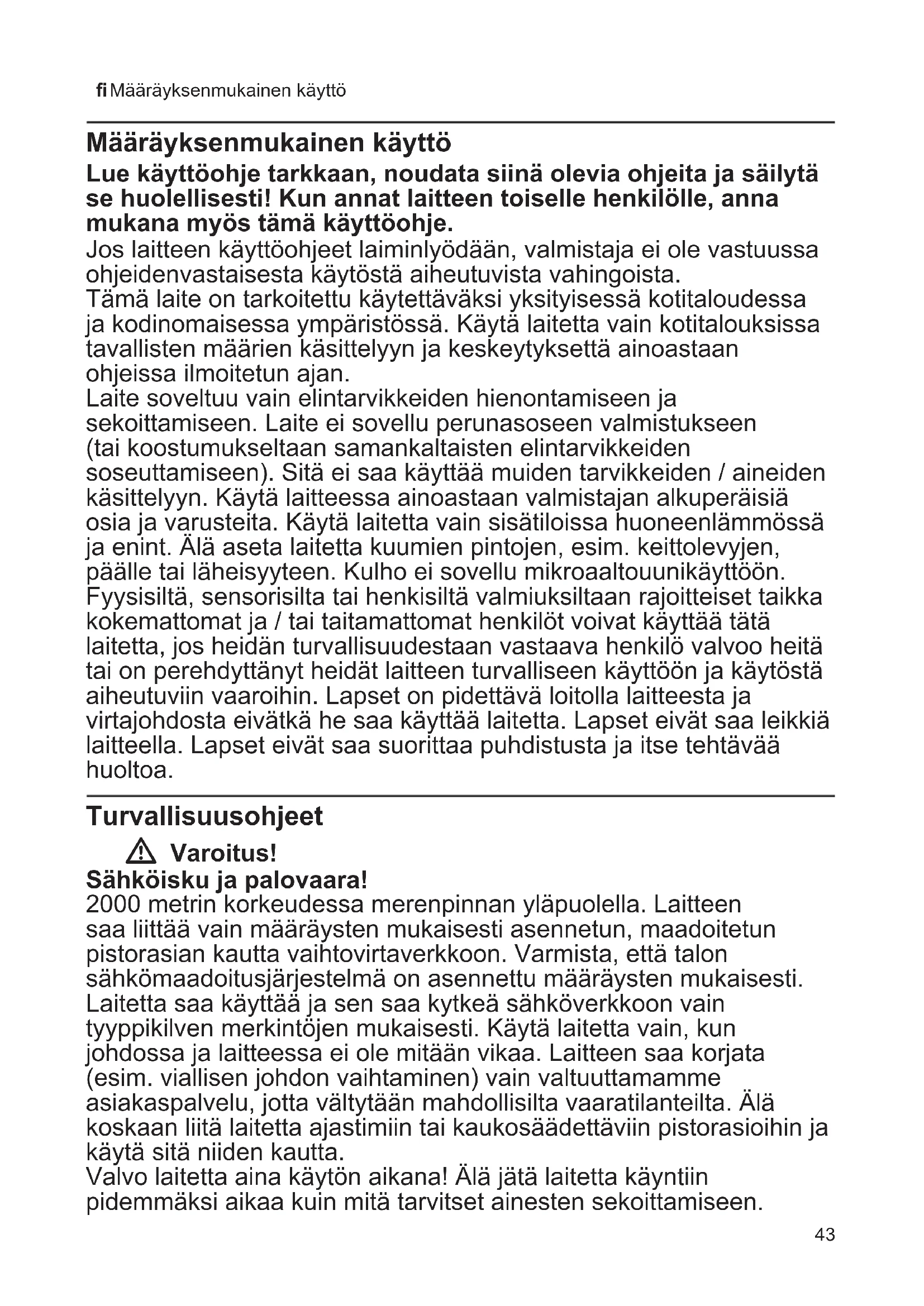 - Määräyksenmukainen käyttö Määräyksenmukainen käyttö Lue käyttöohje tarkkaan, noudata siinä olevia ohjeita ja säilytä se huolellisesti! Kun annat laitteen toiselle henkilölle, anna mukana myös tämä käyttöohje. Jos laitteen käyttöohjeet laiminlyödään, valmistaja ei ole vastuussa ohjeidenvastaisesta käytöstä aiheutuvista vahingoista. Tämä laite on tarkoitettu käytettäväksi yksityisessä kotitaloudessa ja kodinomaisessa ympäristössä. Käytä laitetta vain kotitalouksissa tavallisten määrien käsittelyyn ja keskeytyksettä ainoastaan ohjeissa ilmoitetun ajan. Laite soveltuu vain elintarvikkeiden hienontamiseen ja sekoittamiseen. Laite ei sovellu perunasoseen valmistukseen (tai koostumukseltaan samankaltaisten elintarvikkeiden soseuttamiseen). Sitä ei saa käyttää muiden tarvikkeiden / aineiden käsittelyyn. Käytä laitteessa ainoastaan valmistajan alkuperäisiä osia ja varusteita. Käytä laitetta vain sisätiloissa huoneenlämmössä ja enint. Älä aseta laitetta kuumien pintojen, esim. keittolevyjen, päälle tai läheisyyteen. Kulho ei sovellu mikroaaltouunikäyttöön. Fyysisiltä, sensorisilta tai henkisiltä valmiuksiltaan rajoitteiset taikka kokemattomat ja / tai taitamattomat henkilöt voivat käyttää tätä laitetta, jos heidän turvallisuudestaan vastaava henkilö valvoo heitä tai on perehdyttänyt heidät laitteen turvalliseen käyttöön ja käytöstä aiheutuviin vaaroihin. Lapset on pidettävä loitolla laitteesta ja virtajohdosta eivätkä he saa käyttää laitetta. Lapset eivät saa leikkiä laitteella. Lapset eivät saa suorittaa puhdistusta ja itse tehtävää huoltoa. Turvallisuusohjeet W Varoitus! Sähköisku ja palovaara! 2000 metrin korkeudessa merenpinnan yläpuolella. Laitteen saa liittää vain määräysten mukaisesti asennetun, maadoitetun pistorasian kautta vaihtovirtaverkkoon. Varmista, että talon sähkömaadoitusjärjestelmä on asennettu määräysten mukaisesti. Laitetta saa käyttää ja sen saa kytkeä sähköverkkoon vain tyyppikilven merkintöjen mukaisesti. Käytä laitetta vain, kun johdossa ja laitteessa ei ole mitään vikaa. Laitteen saa korjata (esim. viallisen johdon vaihtaminen) vain valtuuttamamme asiakaspalvelu, jotta vältytään mahdollisilta vaaratilanteilta. Älä koskaan liitä laitetta ajastimiin tai kaukosäädettäviin pistorasioihin ja käytä sitä niiden kautta. Valvo laitetta aina käytön aikana! Älä jätä laitetta käyntiin pidemmäksi aikaa kuin mitä tarvitset ainesten sekoittamiseen.44 Turvallisuusohjeet Verkkojohto ei saa joutua kosketuksiin kuumien osien kanssa eikä sitä saa vetää terävien reunojen yli. Älä koskaan upota peruslaitetta veteen tai pese sitä astianpesukoneessa. Älä käytä laitetta märin käsin tai tyhjäkäynnillä. Varo käytön aikana, ettei sekoitusjalan ja peruslaitteen liitoskohta uppoa sekoitettaviin aineksiin. Laite on irrotettava verkkovirrasta aina, kun sen käyttö lopetetaan, sitä ei voida valvoa, ennen sen kokoamista, purkamista tai puhdistusta sekä häiriötilanteissa. W Varoitus! Loukkaantumisvaara! Muista olla varovainen, kun käsittelet teräviä leikkuuteriä, tyhjennät kulhoa ja puhdistat laitetta. Käytön jälkeen odota, kunnes sauva- sekoittimen terä pysähtyy. Ennen kuin vaihdat liikkuvia varuste- tai lisätarvikeosia, laite on kytkettävä pois toiminnasta ja erotettava verkkovirrasta. Irrota ja kiinnitä varuste vain laitteen ollessa pysäh- dyksissä. Älä missään tapauksessa koske sauvasekoittimen terään. Älä koskaan puhdista terää paljain käsin. Käytä pesemiseen harjaa. W Varoitus! Polttamisvaara! Varo sekoittaessasi kuumia aineksia. Kuumat ainekset voivat roiskua sekoittamisen aikana. Älä koskaan aseta sekoitusjalkaa kuumille pinnoille tai käytä sitä hyvin kuumien ainesten sekoit- tamiseen. Anna kiehuvien ainesten jäähtyä ennen sekoittamista 80°C:seen tai sen alapuolelle. Nosta kattila liedeltä, ennen kuin käytät sauvasekoitinta kattilassa. W Varoitus! Tukehtumisvaara! Älä anna lasten leikkiä pakkausmateriaalilla. Onneksi olkoon, valintasi on Bosch. Lisätietoja tuotteistamme löydät internet-sivuiltamme. Sisältö Määräyksenmukainen käyttö p. 43