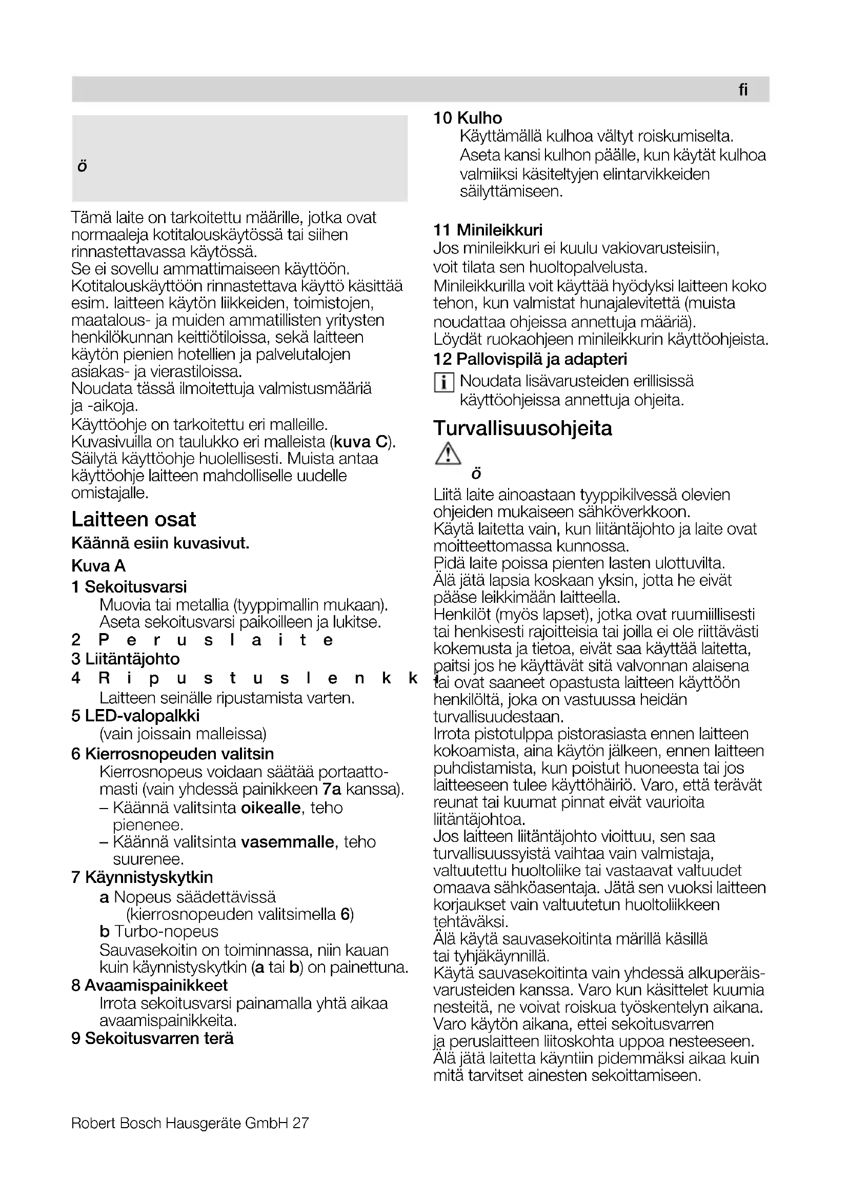 Rätten till ändringar förbehålles.Robert Bosch Hausgeräte GmbH 27 Tämä laite on tarkoitettu määrille, jotka ovat normaaleja kotitalouskäytössä tai siihen rinnastettavassa käytössä. Se ei sovellu ammattimaiseen käyttöön. Kotitalouskäyttöön rinnastettava käyttö käsittää esim. laitteen käytön liikkeiden, toimistojen, maatalous- ja muiden ammatillisten yritysten henkilökunnan keittiötiloissa, sekä laitteen käytön pienien hotellien ja palvelutalojen asiakas- ja vierastiloissa. Noudata tässä ilmoitettuja valmistusmääriä ja -aikoja. Käyttöohje on tarkoitettu eri malleille. Kuvasivuilla on taulukko eri malleista (kuva C). Säilytä käyttöohje huolellisesti. Muista antaa käyttöohje laitteen mahdolliselle uudelle omistajalle. Laitteen osat Käännä esiin kuvasivut. Kuva A 1 Sekoitusvarsi Muovia tai metallia (tyyppimallin mukaan). Aseta sekoitusvarsi paikoilleen ja lukitse. 2Peruslaite 3 Liitäntäjohto 4Ripustuslenkki Laitteen seinälle ripustamista varten. 5 LED-valopalkki (vain joissain malleissa) 6 Kierrosnopeuden valitsin Kierrosnopeus voidaan säätää portaatto- masti (vain yhdessä painikkeen 7a kanssa). – Käännä valitsinta oikealle, teho pienenee. – Käännä valitsinta vasemmalle, teho suurenee. 7 Käynnistyskytkin a Nopeus säädettävissä (kierrosnopeuden valitsimella 6) b Turbo-nopeus Sauvasekoitin on toiminnassa, niin kauan kuin käynnistyskytkin (a tai b) on painettuna. 8 Avaamispainikkeet Irrota sekoitusvarsi painamalla yhtä aikaa avaamispainikkeita. 9 Sekoitusvarren terä 10 Kulho Käyttämällä kulhoa vältyt roiskumiselta. Aseta kansi kulhon päälle, kun käytät kulhoa valmiiksi käsiteltyjen elintarvikkeiden säilyttämiseen. s~áå=àçáëë~âáå=ã~ääÉáëë~W 11 Minileikkuri Jos minileikkuri ei kuulu vakiovarusteisiin, voit tilata sen huoltopalvelusta. Minileikkurilla voit käyttää hyödyksi laitteen koko tehon, kun valmistat hunajalevitettä (muista noudattaa ohjeissa annettuja määriä). Löydät ruokaohjeen minileikkurin käyttöohjeista. 12 Pallovispilä ja adapteri Noudata lisävarusteiden erillisissä käyttöohjeissa annettuja ohjeita. Turvallisuusohjeita içìââ~~åíìãáëî~~ê~ p®Üâ∏áëâìå=î~~ê~ Liitä laite ainoastaan tyyppikilvessä olevien ohjeiden mukaiseen sähköverkkoon. Käytä laitetta vain, kun liitäntäjohto ja laite ovat moitteettomassa kunnossa. Pidä laite poissa pienten lasten ulottuvilta. Älä jätä lapsia koskaan yksin, jotta he eivät pääse leikkimään laitteella. Henkilöt (myös lapset), jotka ovat ruumiillisesti tai henkisesti rajoitteisia tai joilla ei ole riittävästi kokemusta ja tietoa, eivät saa käyttää laitetta, paitsi jos he käyttävät sitä valvonnan alaisena tai ovat saaneet opastusta laitteen käyttöön henkilöltä, joka on vastuussa heidän turvallisuudestaan. Irrota pistotulppa pistorasiasta ennen laitteen kokoamista, aina käytön jälkeen, ennen laitteen puhdistamista, kun poistut huoneesta tai jos laitteeseen tulee käyttöhäiriö. Varo, että terävät reunat tai kuumat pinnat eivät vaurioita liitäntäjohtoa. Jos laitteen liitäntäjohto vioittuu, sen saa turvallisuussyistä vaihtaa vain valmistaja, valtuutettu huoltoliike tai vastaavat valtuudet omaava sähköasentaja. Jätä sen vuoksi laitteen korjaukset vain valtuutetun huoltoliikkeen tehtäväksi. Älä käytä sauvasekoitinta märillä käsillä tai tyhjäkäynnillä. Käytä sauvasekoitinta vain yhdessä alkuperäis- varusteiden kanssa. Varo kun käsittelet kuumia nesteitä, ne voivat roiskua työskentelyn aikana. Varo käytön aikana, ettei sekoitusvarren ja peruslaitteen liitoskohta uppoa nesteeseen. Älä jätä laitetta käyntiin pidemmäksi aikaa kuin mitä tarvitset ainesten sekoittamiseen.