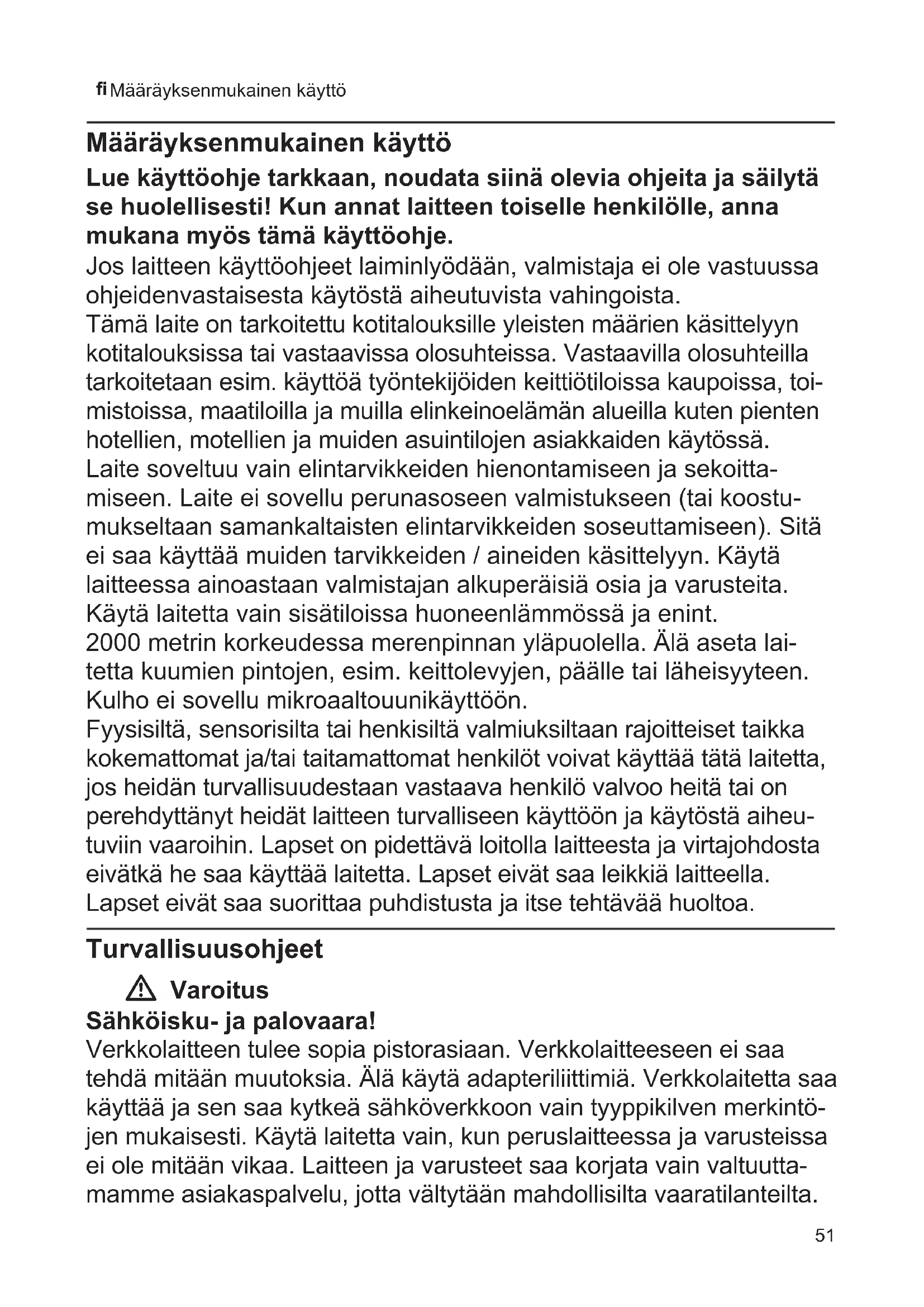 Määräyksenmukainen käyttö Määräyksenmukainen käyttö Lue käyttöohje tarkkaan, noudata siinä olevia ohjeita ja säilytä se huolellisesti! Kun annat laitteen toiselle henkilölle, anna mukana myös tämä käyttöohje. Jos laitteen käyttöohjeet laiminlyödään, valmistaja ei ole vastuussa ohjeidenvastaisesta käytöstä aiheutuvista vahingoista. Tämä laite on tarkoitettu kotitalouksille yleisten määrien käsittelyyn kotitalouksissa tai vastaavissa olosuhteissa. Vastaavilla olosuhteilla tarkoitetaan esim. käyttöä työntekijöiden keittiötiloissa kaupoissa, toi- mistoissa, maatiloilla ja muilla elinkeinoelämän alueilla kuten pienten hotellien, motellien ja muiden asuintilojen asiakkaiden käytössä. Laite soveltuu vain elintarvikkeiden hienontamiseen ja sekoitta- miseen. Laite ei sovellu perunasoseen valmistukseen (tai koostu- mukseltaan samankaltaisten elintarvikkeiden soseuttamiseen). Sitä ei saa käyttää muiden tarvikkeiden / aineiden käsittelyyn. Käytä laitteessa ainoastaan valmistajan alkuperäisiä osia ja varusteita. Käytä laitetta vain sisätiloissa huoneenlämmössä ja enint. 2000 metrin korkeudessa merenpinnan yläpuolella. Älä aseta lai- tetta kuumien pintojen, esim. keittolevyjen, päälle tai läheisyyteen. Kulho ei sovellu mikroaaltouunikäyttöön. Fyysisiltä, sensorisilta tai henkisiltä valmiuksiltaan rajoitteiset taikka kokemattomat ja/tai taitamattomat henkilöt voivat käyttää tätä laitetta, jos heidän turvallisuudestaan vastaava henkilö valvoo heitä tai on perehdyttänyt heidät laitteen turvalliseen käyttöön ja käytöstä aiheu- tuviin vaaroihin. Lapset on pidettävä loitolla laitteesta ja virtajohdosta eivätkä he saa käyttää laitetta. Lapset eivät saa leikkiä laitteella. Lapset eivät saa suorittaa puhdistusta ja itse tehtävää huoltoa. Turvallisuusohjeet W Varoitus Sähköisku- ja palovaara! Verkkolaitteen tulee sopia pistorasiaan. Verkkolaitteeseen ei saa tehdä mitään muutoksia. Älä käytä adapteriliittimiä. Verkkolaitetta saa käyttää ja sen saa kytkeä sähköverkkoon vain tyyppikilven merkintö- jen mukaisesti. Käytä laitetta vain, kun peruslaitteessa ja varusteissa ei ole mitään vikaa. Laitteen ja varusteet saa korjata vain valtuutta- mamme asiakaspalvelu, jotta vältytään mahdollisilta vaaratilanteilta.52 Turvallisuusohjeet Jätä akut vain valtuutetun huoltoliikkeen vaihdettavaksi. Käytä vain täydellistä laitetta, jota ei ole purettu osiin ja jonka akuissa ei ole mekaanisia vaurioita. Akkuja ei saa poistaa ja lähettää erikseen. Valvo laitetta aina käytön aikana! Liitäntäjohto ei saa joutua kosketuksiin kuumien osien kanssa eikä sitä saa vetää terävien reunojen yli. Älä koskaan upota peruslaitetta, lataustelinettä ja verkkolaitetta veteen tai pese sitä astianpesukoneessa. Älä käytä laitetta märin käsin tai tyh- jäkäynnillä. Varo käytön aikana, ettei sekoitusvarren ja peruslaitteen liitoskohta uppoa sekoitettaviin aineksiin. Verkkolaite on irrotettava verkkovirrasta aina, kun laitetta ei käytetä, kun akut on ladattu täyteen, ennen laitteen kokoamista, purkamista tai puhdistusta sekä häiriöti- lanteissa. Lataa peruslaite vain laitteen mukana toimitetussa lataus- telineessä ja siihen kuuluvalla verkkolaitteella. Varo, ettei verkkolaite peity. Sen lähellä ei saa olla helposti tuleen syttyviä esineitä. W Varoitus Räjähdysvaara! Suojaa akut kuumuudelta ja tulelta. W Varoitus Loukkaantumisvaara Käytön jälkeen odota, kunnes sauvasekoittimen terä pysähtyy. Ennen kuin vaihdat liikkuvia varuste- tai lisätarvikeosia, laite on kytkettävä pois toiminnasta. Älä missään tapauksessa koske sauva- sekoittimen terään. Älä koskaan puhdista terää paljain käsin. Virheellisessä käytössä peruslaitteeseen asetetusta akusta voi valua ulos nestettä. Vältä kosketusta nesteen kanssa. W Varoitus Polttamisvaara Varo sekoittaessasi kuumia aineksia. Kuumat ainekset voivat roiskua sekoittamisen aikana. Älä koskaan aseta sekoitusvartta kuu- mille pinnoille tai käytä sitä hyvin kuumien ainesten sekoittamiseen. Anna kiehuvien ainesten jäähtyä ennen sekoittamista 80 °C:seen tai sen alapuolelle. Nosta kattila liedeltä, ennen kuin käytät sauvasekoi- tinta kattilassa. W Varoitus Tukehtumisvaara Älä anna lasten leikkiä pakkausmateriaalilla.53
