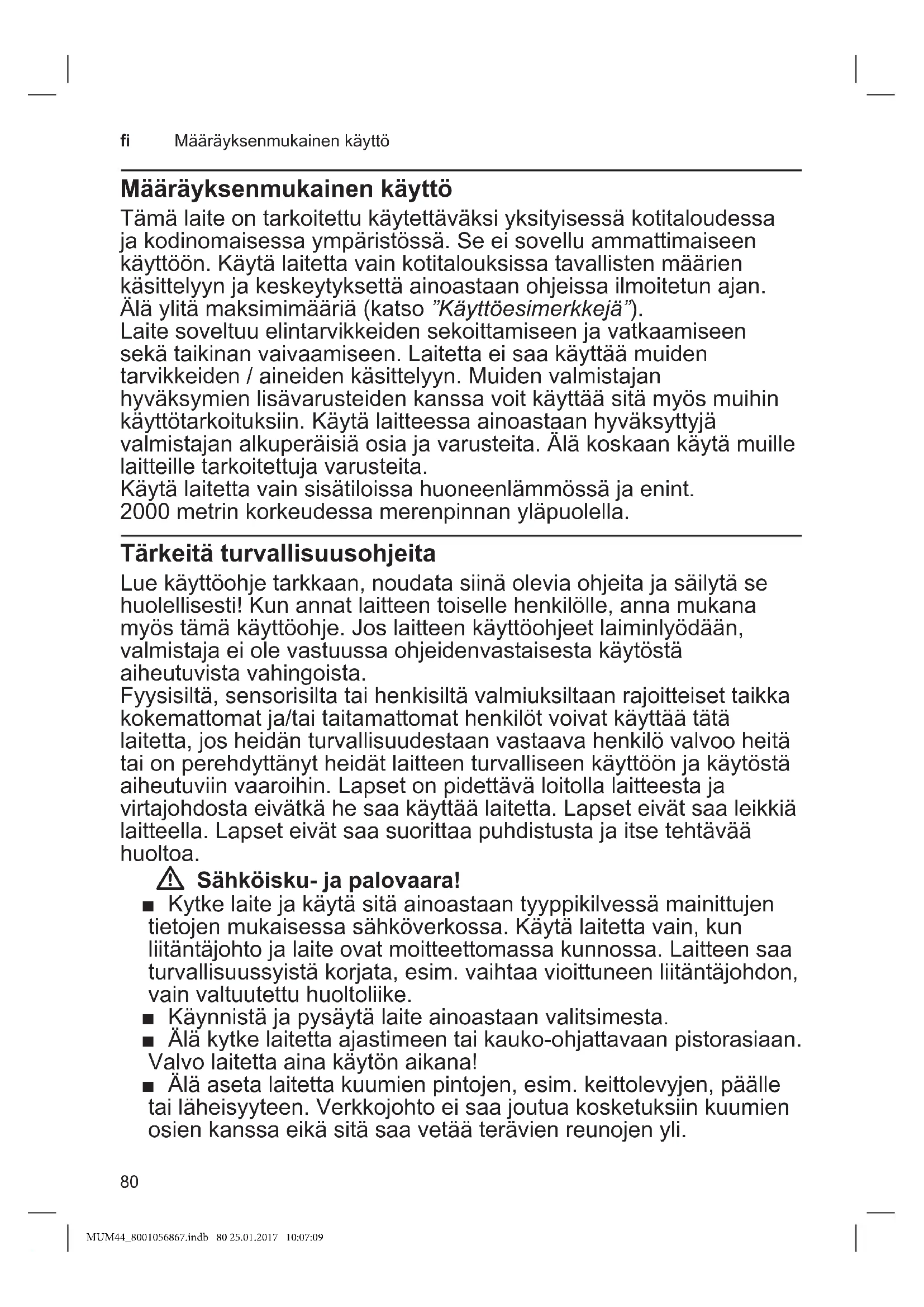 Määräyksenmukainen käyttö Määräyksenmukainen käyttö Tämä laite on tarkoitettu käytettäväksi yksityisessä kotitaloudessa ja kodinomaisessa ympäristössä. Se ei sovellu ammattimaiseen käyttöön. Käytä laitetta vain kotitalouksissa tavallisten määrien käsittelyyn ja keskeytyksettä ainoastaan ohjeissa ilmoitetun ajan. Älä ylitä maksimimääriä (katso ”Käyttöesimerkkejä”). Laite soveltuu elintarvikkeiden sekoittamiseen ja vatkaamiseen sekä taikinan vaivaamiseen. Laitetta ei saa käyttää muiden tarvikkeiden / aineiden käsittelyyn. Muiden valmistajan hyväksymien lisävarusteiden kanssa voit käyttää sitä myös muihin käyttötarkoituksiin. Käytä laitteessa ainoastaan hyväksyttyjä valmistajan alkuperäisiä osia ja varusteita. Älä koskaan käytä muille laitteille tarkoitettuja varusteita. Käytä laitetta vain sisätiloissa huoneenlämmössä ja enint. 2000 metrin korkeudessa merenpinnan yläpuolella. Tärkeitä turvallisuusohjeita Lue käyttöohje tarkkaan, noudata siinä olevia ohjeita ja säilytä se huolellisesti! Kun annat laitteen toiselle henkilölle, anna mukana myös tämä käyttöohje. Jos laitteen käyttöohjeet laiminlyödään, valmistaja ei ole vastuussa ohjeidenvastaisesta käytöstä aiheutuvista vahingoista. Fyysisiltä, sensorisilta tai henkisiltä valmiuksiltaan rajoitteiset taikka kokemattomat ja/tai taitamattomat henkilöt voivat käyttää tätä laitetta, jos heidän turvallisuudestaan vastaava henkilö valvoo heitä tai on perehdyttänyt heidät laitteen turvalliseen käyttöön ja käytöstä aiheutuviin vaaroihin. Lapset on pidettävä loitolla laitteesta ja virtajohdosta eivätkä he saa käyttää laitetta. Lapset eivät saa leikkiä laitteella. Lapset eivät saa suorittaa puhdistusta ja itse tehtävää huoltoa. W Sähköisku- ja palovaara! ■ Kytke laite ja käytä sitä ainoastaan tyyppikilvessä mainittujen tietojen mukaisessa sähköverkossa. Käytä laitetta vain, kun liitäntäjohto ja laite ovat moitteettomassa kunnossa. Laitteen saa turvallisuussyistä korjata, esim. vaihtaa vioittuneen liitäntäjohdon, vain valtuutettu huoltoliike. ■ Käynnistä ja pysäytä laite ainoastaan valitsimesta. ■ Älä kytke laitetta ajastimeen tai kaukoohjattavaan pistorasiaan. Valvo laitetta aina käytön aikana! ■ Älä aseta laitetta kuumien pintojen, esim. keittolevyjen, päälle tai läheisyyteen. Verkkojohto ei saa joutua kosketuksiin kuumien osien kanssa eikä sitä saa vetää terävien reunojen yli. MUM44_8001056867.indb 80 25.01.2017 10:07:0981