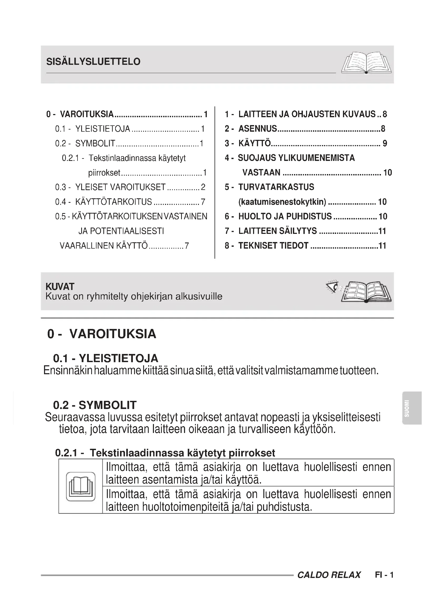 säätää tai puhdistaa laitetta eikä suorittaa käyttäjälle kuulu- via huoltotoimenpiteitä.CALDO RELAX FI - 5 SUOMI