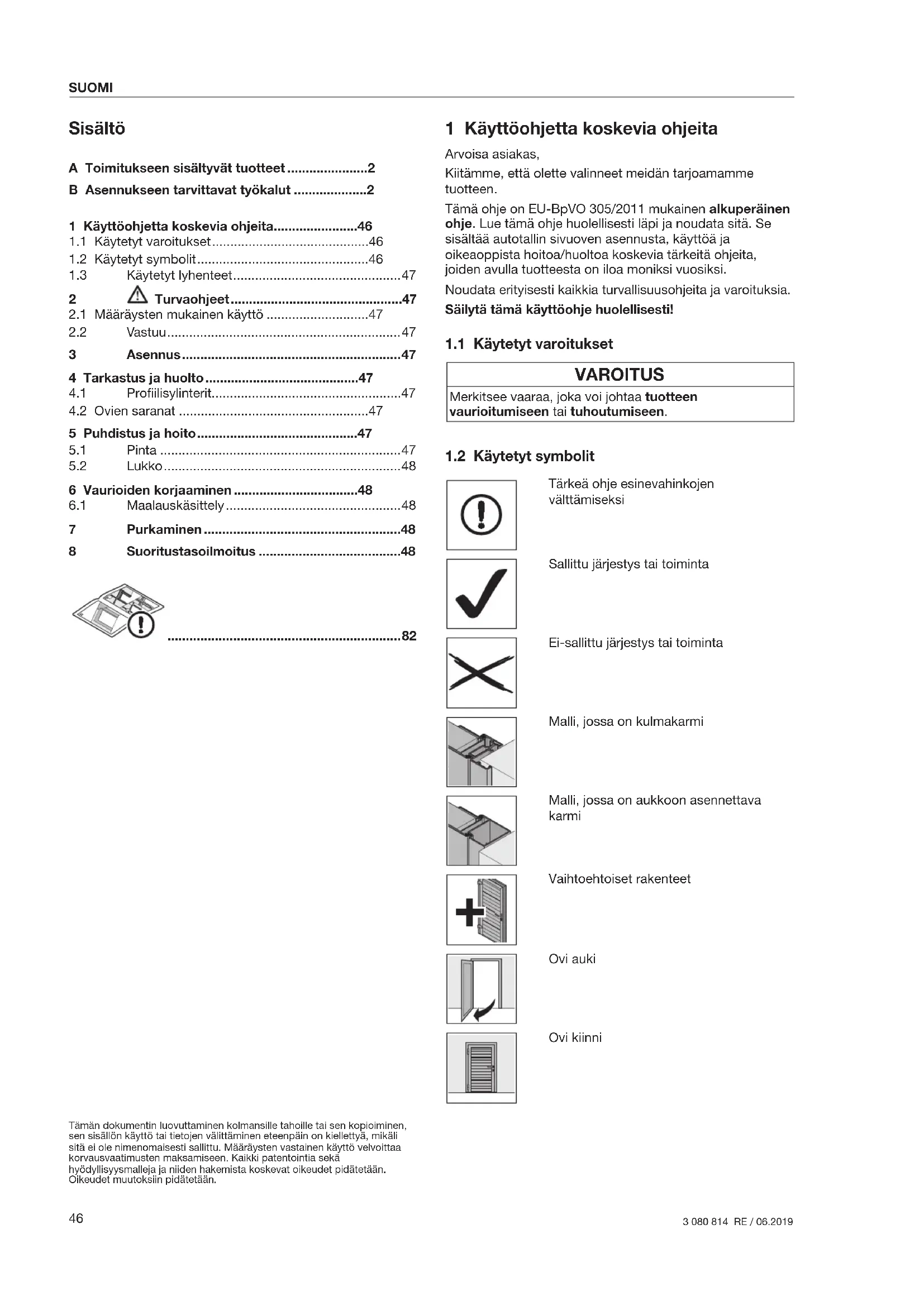 Tärkeä ohje esinevahinkojen välttämiseksi Sallittu järjestys tai toiminta Ei-sallittu järjestys tai toiminta Malli, jossa on kulmakarmi Malli, jossa on aukkoon asennettava karmi Vaihtoehtoiset rakenteet Ovi auki Ovi kiinni 1 Käyttöohjetta koskevia ohjeita .......................46
