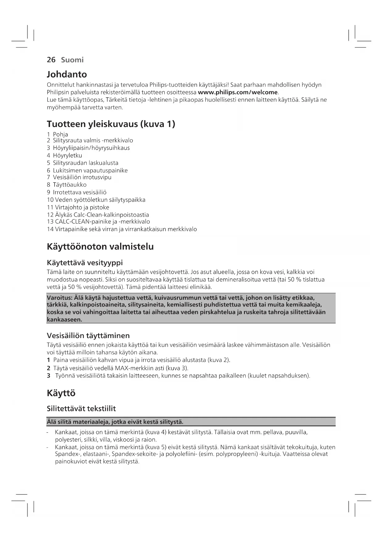 1 Pohja 2 Silitysrauta valmis-merkkivalo 3 Höyryliipaisin/höyrysuihkaus 4 Höyryletku 5 Silitysraudan laskualusta 6 Lukitsimen vapautuspainike 7 Vesisäiliön irrotusvipu 8 Täyttöaukko 9 Irrotettava vesisäiliö 10 Veden syöttöletkun säilytyspaikka 11 Virtajohto ja pistoke 12 Älykäs Calc-Clean-kalkinpoistoastia 13 CALC-CLEAN-painike ja -merkkivalo 14 Virtapainike sekä virran ja virrankatkaisun merkkivalo Käyttöönoton valmistelu Käytettävä vesityyppi Tämä laite on suunniteltu käyttämään vesijohtovettä. Jos asut alueella, jossa on kova vesi, kalkkia voi muodostua nopeasti. Siksi on suositeltavaa käyttää tislattua tai demineralisoitua vettä )tai 50% tislattua vettä ja 50% vesijohtovettä(. Tämä pidentää laitteesi elinikää. Varoitus: Älä käytä hajustettua vettä, kuivausrummun vettä tai vettä, johon on lisätty etikkaa, tärkkiä, kalkinpoistoaineita, silitysaineita, kemiallisesti puhdistettua vettä tai muita kemikaaleja, koska se voi vahingoittaa laitetta tai aiheuttaa veden pirskahtelua ja ruskeita tahroja silitettävään kankaaseen. Vesisäiliön täyttäminen Täytä vesisäiliö ennen jokaista käyttöä tai kun vesisäiliön vesimäärä laskee vähimmäistason alle. Vesisäiliön voi täyttää milloin tahansa käytön aikana. 1 Paina vesisäiliön kahvan vipua ja irrota vesisäiliö alustasta )kuva 2(. 2 Täytä vesisäiliö vedellä MAX-merkkiin asti )kuva 3(. 3 Työnnä vesisäiliötä takaisin laitteeseen, kunnes se napsahtaa paikalleen )kuulet napsahduksen(. Käyttö Silitettävät tekstiilit Älä silitä materiaaleja, jotka eivät kestä silitystä. - Kankaat, joissa on tämä merkintä )kuva 4( kestävät silitystä. Tällaisia ovat mm. pellava, puuvilla, polyesteri, silkki, villa, viskoosi ja raion. - Kankaat, joissa on tämä merkintä )kuva 5( eivät kestä silitystä. Nämä kankaat sisältävät tekokuituja, kuten Spandex-, elastaani-, Spandex-sekoite- ja polyoleini- )esim. polypropyleeni( -kuituja. Vaatteissa olevat painokuviot eivät kestä silitystä. Suomi27 Silittäminen 1 Aseta laite tukevalle ja tasaiselle alustalle. Huomautus: Jotta silitys olisi mahdollisimman turvallista, suosittelemme, että asetat alustan vakaalle silityslaudalle, pöydälle tai lattialle. 2 Varmista että vesisäiliössä on riittävästi vettä. 3 Irrota veden syöttöletku säilytyslokerosta. 4 Liitä virtapistoke maadoitettuun pistorasiaan ja kytke laitteeseen virta painamalla virtapainiketta )kuva 6(. Odota, kunnes Silitysrauta valmis -merkki palaa jatkuvasti )kuva 7(. Tämä kestää 2minuuttia. 5 Irrota silitysrauta silitysraudan laskualustasta painamalla lukitsimen vapautuspainiketta )kuva 8(. 6 Aloita silittäminen pitämällä höyrypainiketta painettuna )kuva 9(. Huomautus: kun alat silittää ja erityisesti käytät höyryliipaisinta ensimmäistä kertaa, höyryn tulemiseen laitteesta voi kulua yli 30 sekuntia. Huomautus: Pumppu käynnistyy aina, kun höyrypainiketta painetaan. Siitä kuuluu hiljaista kolisevaa ääntä. Kun vesisäiliö on tyhjä, pumpun ääni on normaalia voimakkaampi. 7 Saat parhaan lopputuloksen viimeistelemällä höyrysilityksen jälkeen vaatteet ilman höyrytoimintoa. Huomautus: Jos et vapauta liipaisinta ajoissa ja nostat silitysraudan alustalle, höyryn tulo voi jatkua. Se on normaalia. Voit välttää tämän jättämällä silitysraudan silityslaudalle, kun asettelet vaatetta uudelleen. Varoitus: älä koskaan suuntaa höyrysuihkua ihmisiä kohti. MAX-tilan toiminta Voit käyttää tehokkaampaan höyryntuottoon MAX-höyrytystilaa, joka on turvallinen kaikille silitettäville tekstiileille. MAX-höyrytystilaa suositellaan käyttämään puuvilla-, farkku- ja pellavakankaille. 1 Pidä virtapainiketta painettuna 2 sekuntia, kunnes valo muuttuu valkoiseksi. 2 Poista MAX-tila käytöstä painamalla virtapainiketta uudelleen 2 sekunnin ajan, kunnes merkkivalo muuttuu siniseksi. Höyrysuihkaustoiminto 1 Vapauta 3 sekunnin höyrysuihkaus painamalla höyrystimen liipaisinta nopeasti kaksi kertaa )kuva10(. Huomautus: suosittelemme höyrysuihkaustoiminnon käyttämistä vain vaikeiden ryppyjen poistamiseen. Silittäminen pystysuorassa Varoitus: Silitysraudasta vapautuu kuumaa höyryä. Älä koskaan yritä irrottaa ryppyjä vaatteesta,