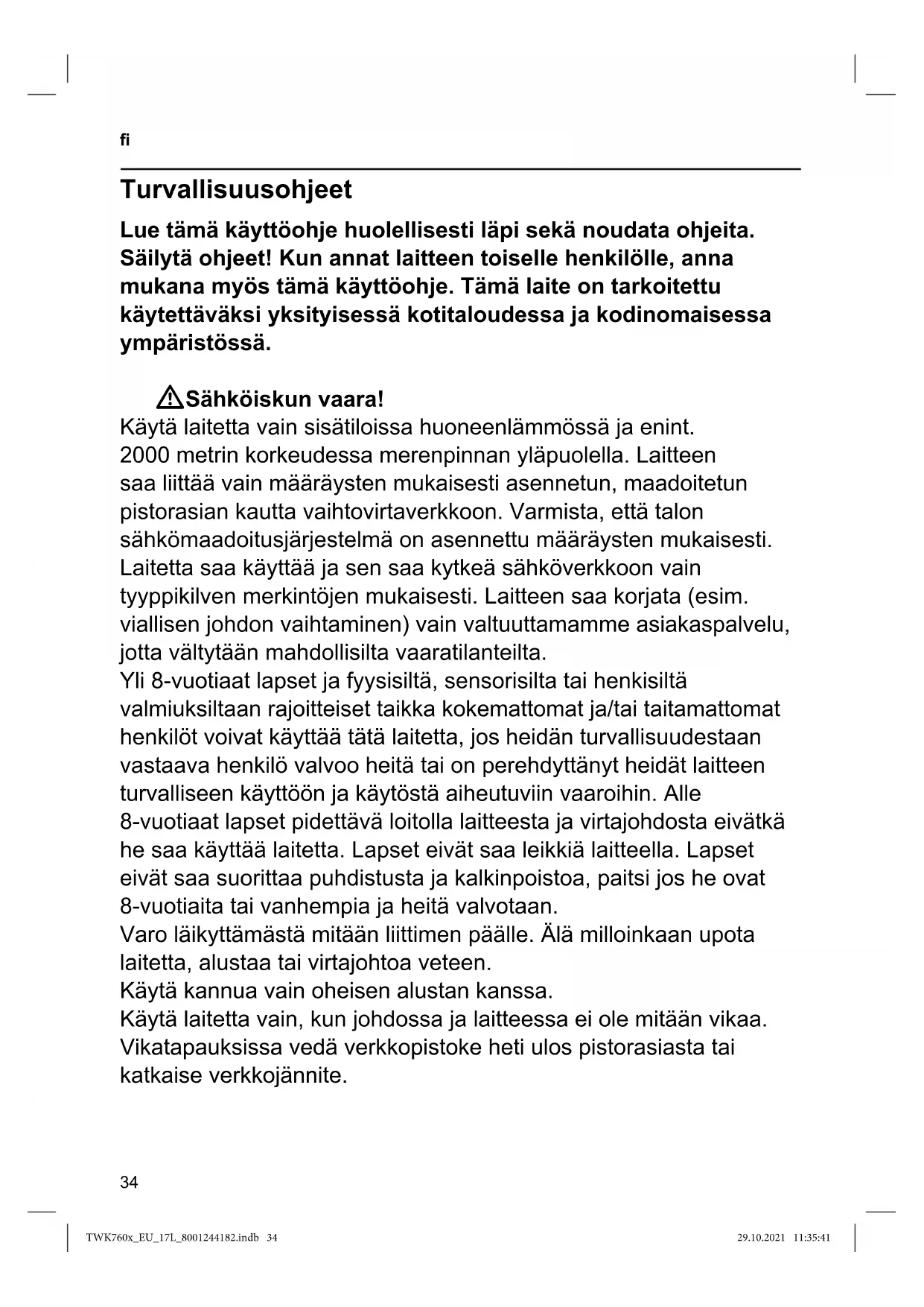 VAROITUS: Tätä laitetta ei saa käyttää kylpyammeiden, suihkujen, pesualtaiden tai muiden vettä sisältävien astioiden läheisyydessä. WTukehtumisvaara! Älä anna lasten leikkiä pakkausmateriaalilla. WLoukkaantumisvaara! Laitteen väärinkäyttö voi johtaa loukkaantumisiin. WHuomio! Elintarvikkeiden kanssa kosketuksissa olevien pintojen puhdistus! Käyttöoppaassa annettuja erityisiä puhdistusohjeita on noudatettava. TWK760x_EU_17L_8001244182.indb 34TWK760x_EU_17L_8001244182.indb 34 29.10.2021 11:35:4129.10.2021 11:35:4135