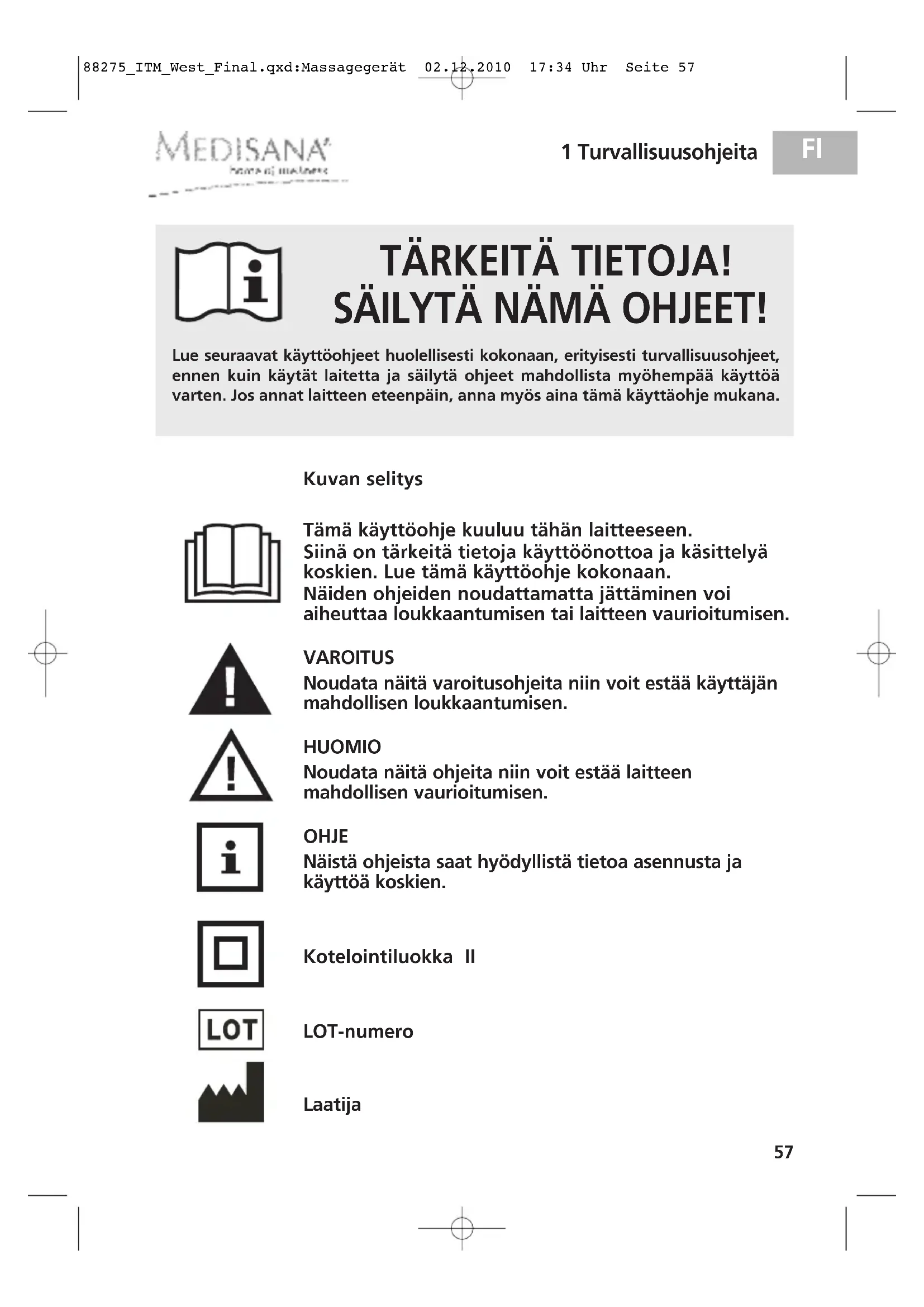 Jotta saavutat laitteella tuloksia ja voit kayttä MEDISANA-hierontalaitetta pitkään, suosittelemme seuraavien kaytöä ja huoltoa koskevien ohjeiden huolellista lukemista.