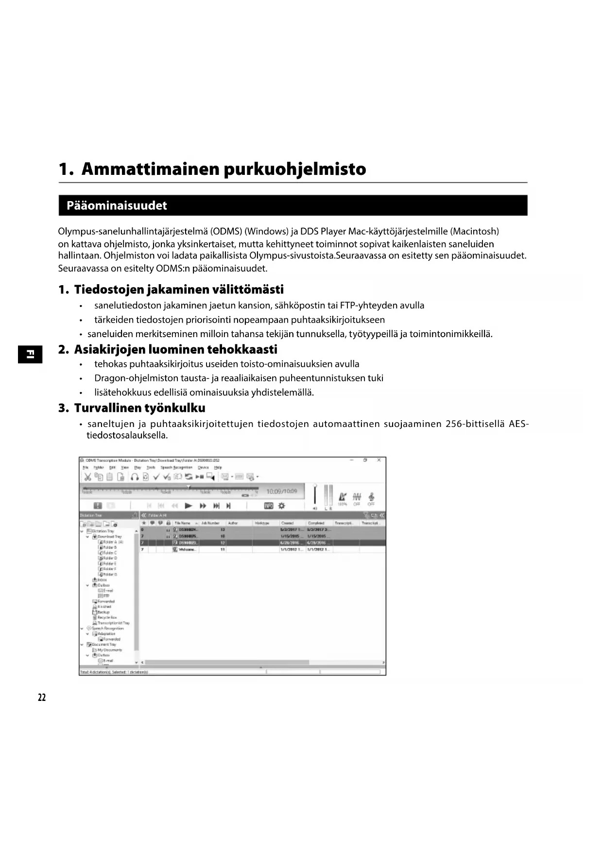 Pääominaisuudet Olympus-sanelunhallintajärjestelmä (ODMS) (Windows) ja DDS Player Mac-käyttöjärjestelmille (Macintosh) on kattava ohjelmisto, jonka yksinkertaiset, mutta kehittyneet toiminnot sopivat kaikenlaisten saneluiden hallintaan. Ohjelmiston voi ladata paikallisista Olympus-sivustoista.Seuraavassa on esitetty sen pääominaisuudet. Seuraavassa on esitelty ODMS:n pääominaisuudet.