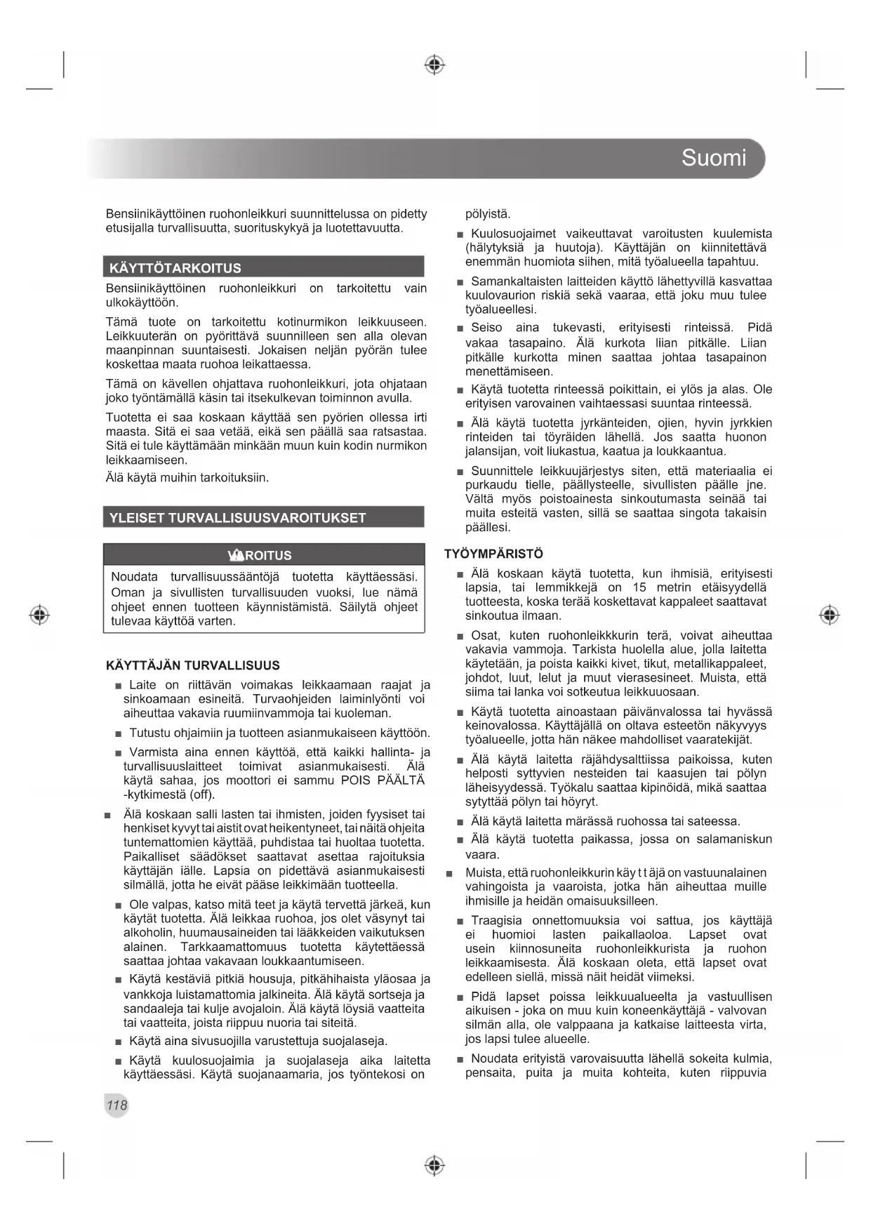 Bensiinikäyttöinen ruohonleikkuri on tarkoitettu vain ulkokäyttöön. Tämä tuote on tarkoitettu kotinurmikon leikkuuseen. Leikkuuterän on pyörittävä suunnilleen sen alla olevan maanpinnan suuntaisesti. Jokaisen neljän pyörän tulee koskettaa maata ruohoa leikattaessa. Tämä on kävellen ohjattava ruohonleikkuri, jota ohjataan joko työntämällä käsin tai itsekulkevan toiminnon avulla. Tuotetta ei saa koskaan käyttää sen pyörien ollessa irti maasta. Sitä ei saa vetää, eikä sen päällä saa ratsastaa. Sitä ei tule käyttämään minkään muun kuin kodin nurmikon leikkaamiseen. Älä käytä muihin tarkoituksiin. YLEISET TURVALLISUUSVAROITUKSET VAROITUS Noudata turvallisuussääntöjä tuotetta käyttäessäsi. Oman ja sivullisten turvallisuuden vuoksi, lue nämä ohjeet ennen tuotteen käynnistämistä. Säilytä ohjeet tulevaa käyttöä varten.