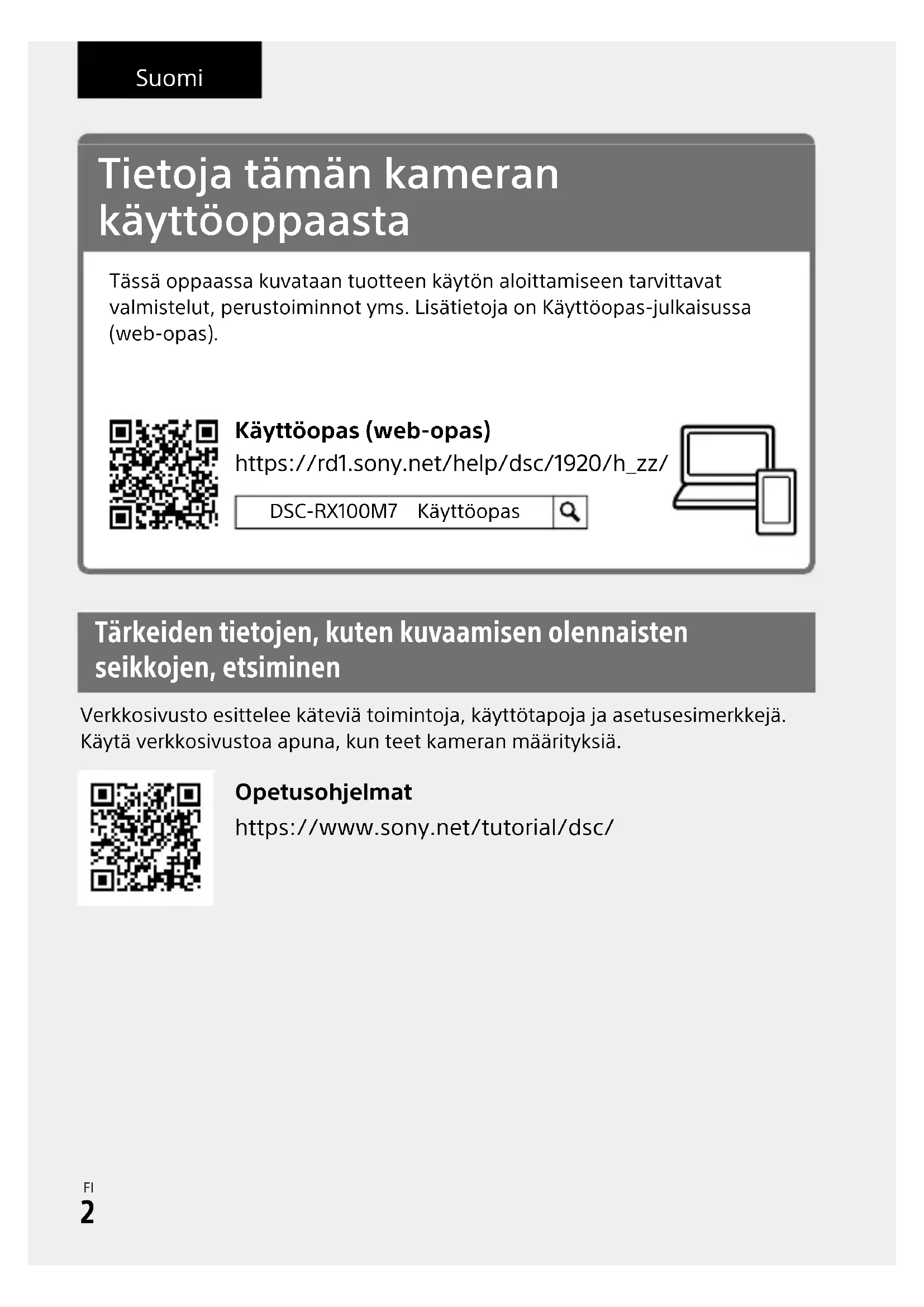 C:\5007141311_15lang\5007141311DSCRX100M7CE3\13FI-DSCRX100M7CE3\13FI.indd DTP data saved: 2019/05/10 16:04 PDF file created: 2019/05/13 16:15 Suomi Tietoja tämän kameran käyttöoppaasta Tässä oppaassa kuvataan tuotteen käytön aloittamiseen tarvittavat valmistelut, perustoiminnot yms. Lisätietoja on Käyttöopas-julkaisussa (web-opas). https://rd1.sony.net/help/dsc/1920/h_zz/ Käyttöopas (web-opas) DSC-RX100M7 Käyttöopas Tärkeiden tietojen, kuten kuvaamisen olennaisten seikkojen, etsiminen Verkkosivusto esittelee käteviä toimintoja, käyttötapoja ja asetusesimerkkejä.Käytä verkkosivustoa apuna, kun teet kameran määrityksiä. https://www.sony.net/tutorial/dsc/ OpetusohjelmatDSC-RX100M75-007-141-31(1)