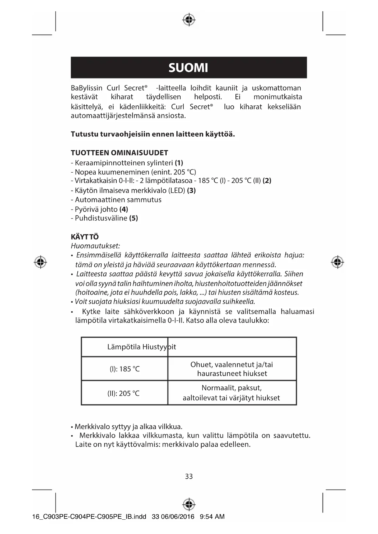 - Rengjøringsverktøyet kan brukes mange ganger. Bare erne lten, skyll den i såpevann og la den tørke før du bruker den igjen. Apparatets utside kan tørkes med en fuktig klut når det er nedkjølt og ikke tilkoblet strømnettet. Pass på at apparatet er fullstendig tørt før du setter i støpselet igjen. 16_C903PE-C904PE-C905PE_IB.indd 32 06/06/2016 9:54 AM33 SUOMI BaBylissin Curl Secret® -laitteella loihdit kauniit ja uskomattoman kestävät kiharat täydellisen helposti. Ei monimutkaista käsittelyä, ei kädenliikkeitä: Curl Secret® luo kiharat kekseliään automaattijärjestelmänsä ansiosta. Tutustu turvaohjeisiin ennen laitteen käyttöä. TUOTTEEN OMINAISUUDET - Keraamipinnotteinen sylinteri (1) - Nopea kuumeneminen (enint. 205 °C) - Virtakatkaisin 0-I-II: - 2 lämpötilatasoa - 185 °C (I) - 205 °C (II) (2) - Käytön ilmaiseva merkkivalo (LED) (3) - Automaattinen sammutus - Pyörivä johto (4) - Puhdistusväline (5)