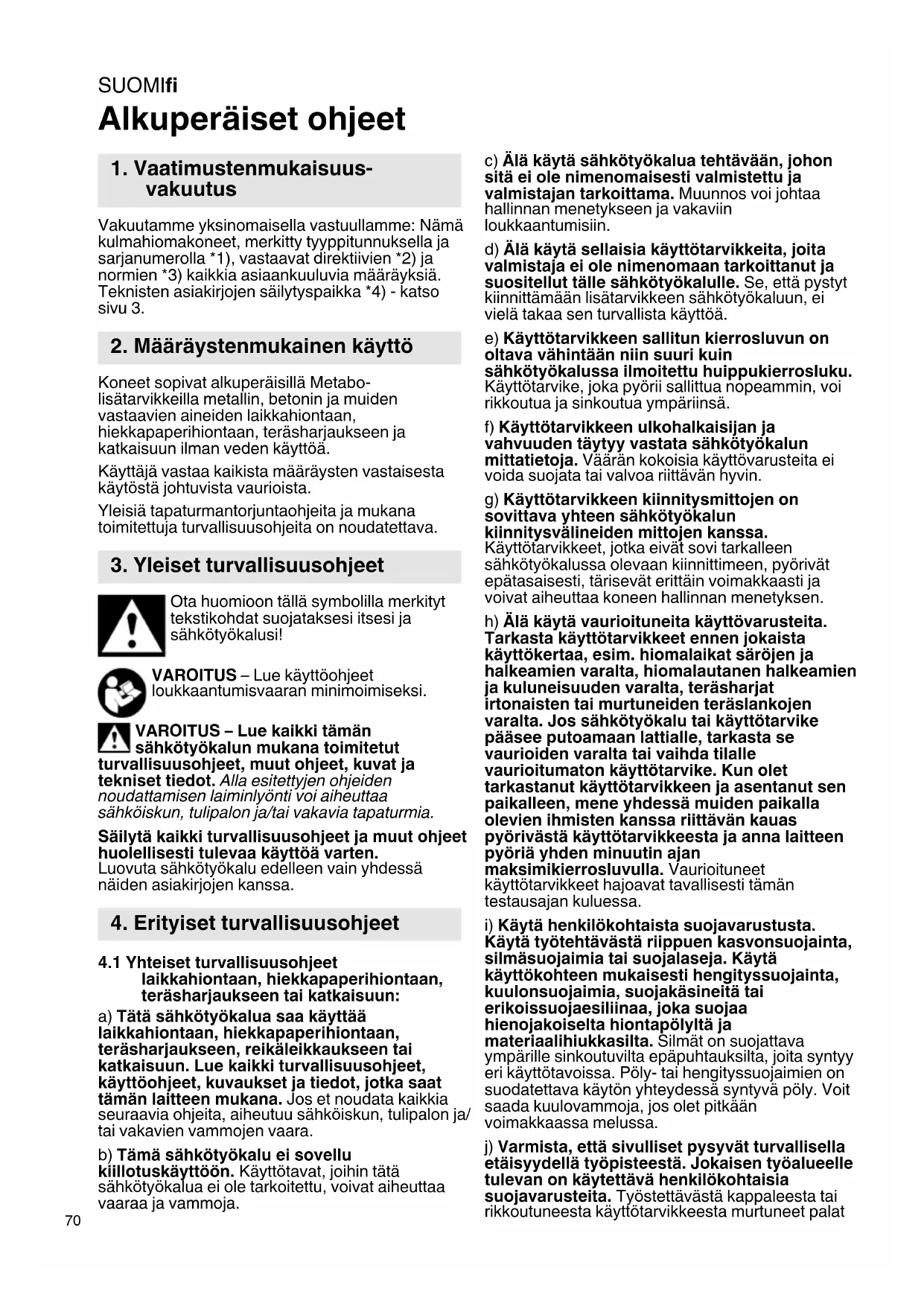 Alkuperäiset ohjeet Vakuutamme yksinomaisella vastuullamme: Nämä kulmahiomakoneet, merkitty tyyppitunnuksella ja sarjanumerolla *1), vastaavat direktiivien *2) ja normien *3) kaikkia asiaankuuluvia määräyksiä. Teknisten asiakirjojen säilytyspaikka *4) - katso sivu 3. Koneet sopivat alkuperäisillä Metabo- lisätarvikkeilla metallin, betonin ja muiden vastaavien aineiden laikkahiontaan, hiekkapaperihiontaan, teräsharjaukseen ja katkaisuun ilman veden käyttöä. Käyttäjä vastaa kaikista määräysten vastaisesta käytöstä johtuvista vaurioista. Yleisiä tapaturmantorjuntaohjeita ja mukana toimitettuja turvallisuusohjeita on noudatettava. Ota huomioon tällä symbolilla merkityt tekstikohdat suojataksesi itsesi ja sähkötyökalusi! VAROITUS – Lue käyttöohjeet loukkaantumisvaaran minimoimiseksi. VAROITUS – Lue kaikki tämän sähkötyökalun mukana toimitetut turvallisuusohjeet, muut ohjeet, kuvat ja tekniset tiedot. Alla esitettyjen ohjeiden noudattamisen laiminlyönti voi aiheuttaa sähköiskun, tulipalon ja/tai vakavia tapaturmia. Säilytä kaikki turvallisuusohjeet ja muut ohjeet huolellisesti tulevaa käyttöä varten. Luovuta sähkötyökalu edelleen vain yhdessä näiden asiakirjojen kanssa.