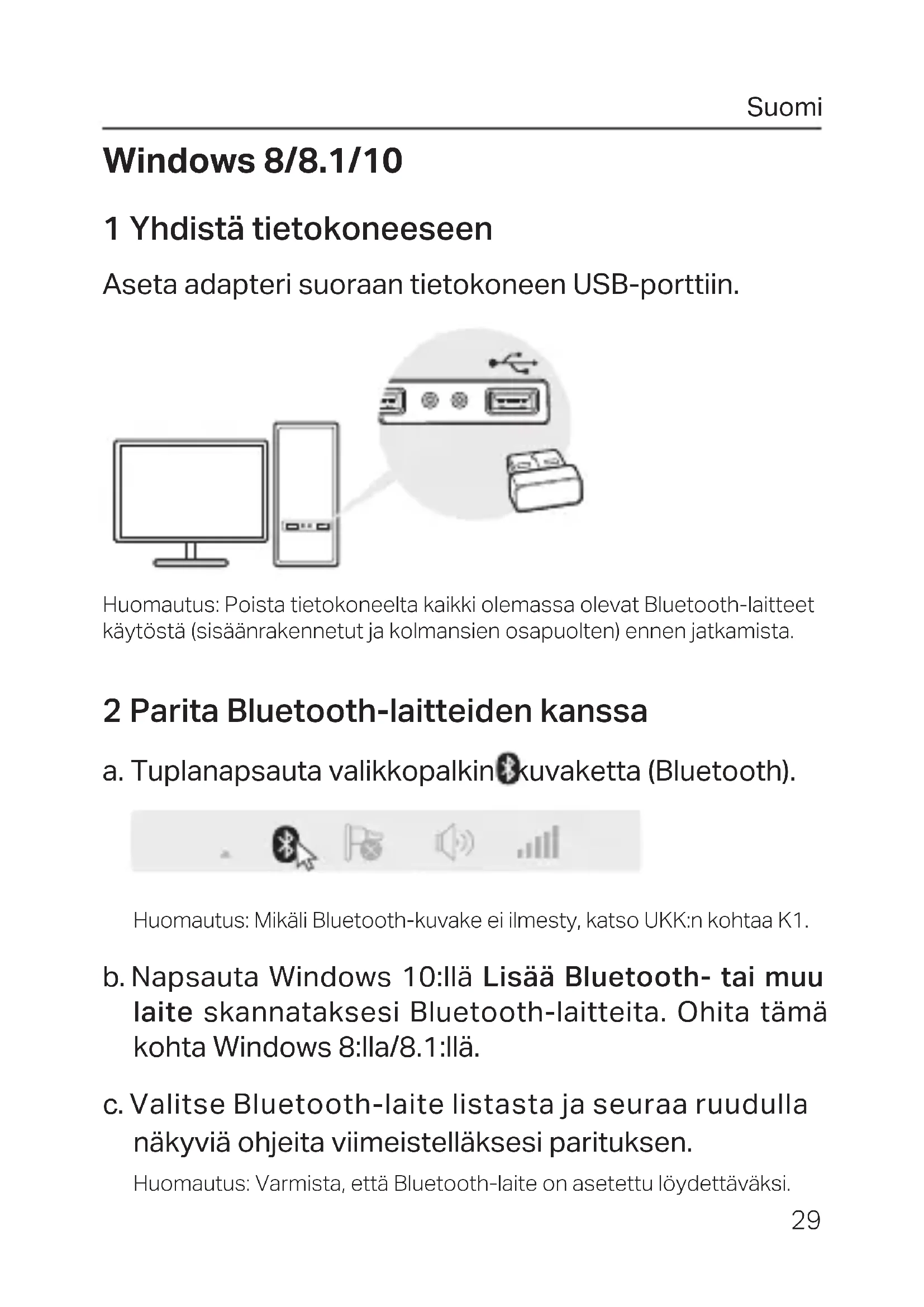 Windows 8/8.1/10 1 Yhdistä tietokoneeseen Aseta adapteri suoraan tietokoneen USB-porttiin. Huomautus: Poista tietokoneelta kaikki olemassa olevat Bluetooth-laitteet käytöstä (sisäänrakennetut ja kolmansien osapuolten) ennen jatkamista. 2 Parita Bluetooth-laitteiden kanssa a. Tuplanapsauta valikkopalkin kuvaketta (Bluetooth). Huomautus: Mikäli Bluetooth-kuvake ei ilmesty, katso UKK:n kohtaa K1. b. Napsauta Windows 10:llä Lisää Bluetooth- tai muu laite skannataksesi Bluetooth-laitteita. Ohita tämä kohta Windows 8:lla/8.1:llä. c. Valitse Bluetooth-laite listasta ja seuraa ruudulla näkyviä ohjeita viimeistelläksesi parituksen. Huomautus: Varmista, että Bluetooth-laite on asetettu löydettäväksi.Suomi