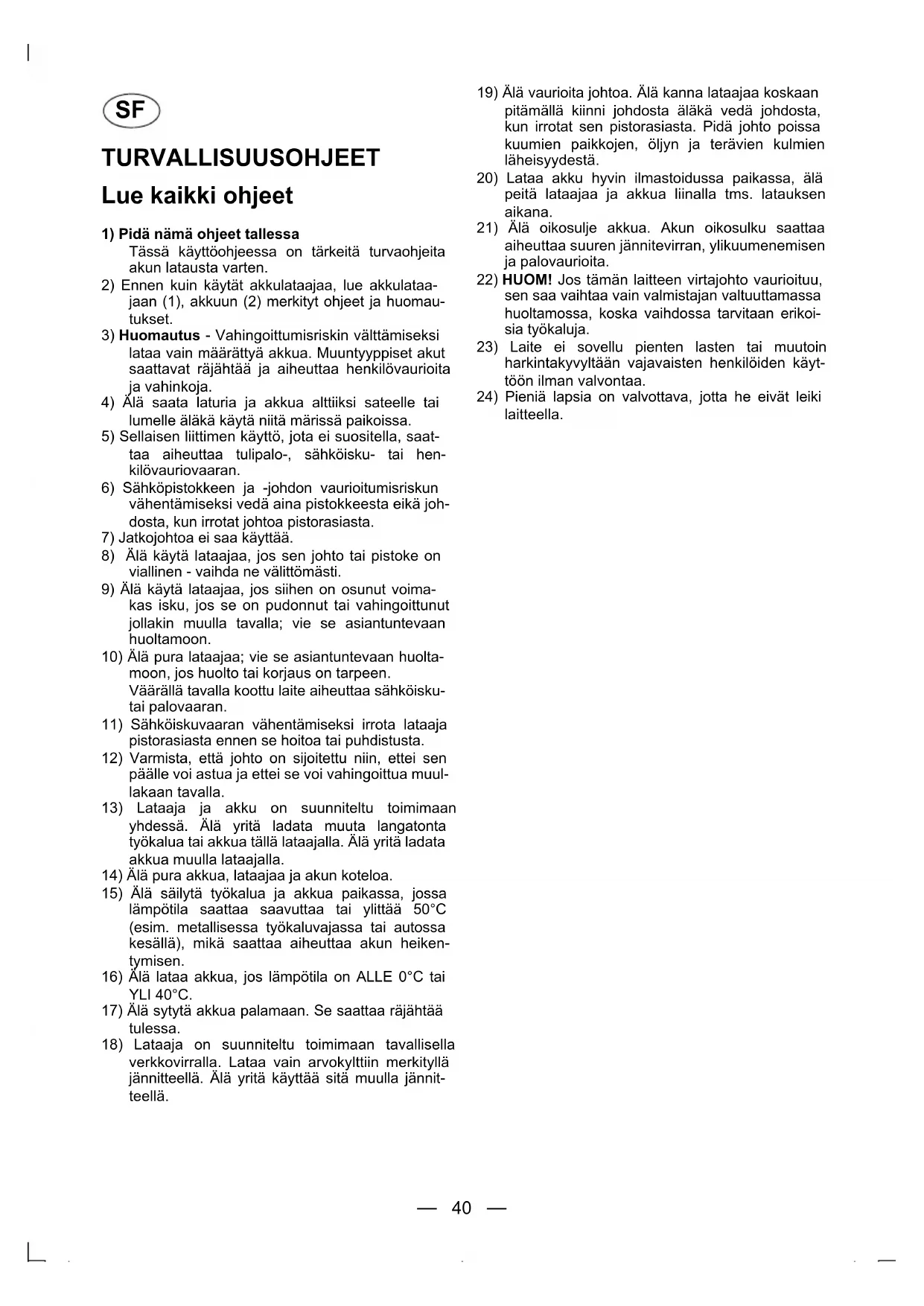16) Älä lataa akkua, jos lämpötila on ALLE 0°C tai