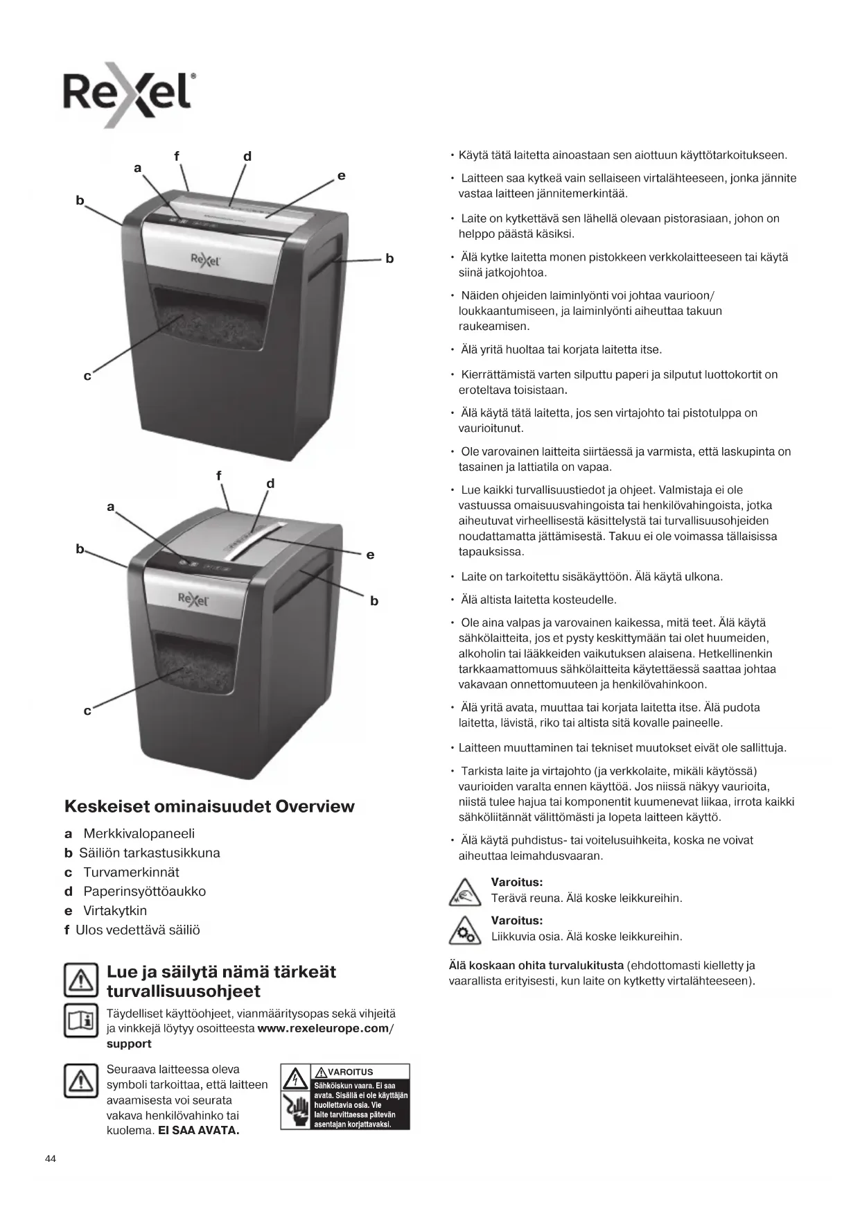 - Älä käytä puhdistus- tai voitelusuihkeita, koska ne voivat aiheuttaa leimahdusvaaran. Lue ja säilytä nämä tärkeät turvallisuusohjeet Täydelliset käyttöohjeet, vianmääritysopas sekä vihjeitä ja vinkkejä löytyy osoitteesta www.rexeleurope.com/ support Seuraava laitteessa oleva symboli tarkoittaa, että laitteen avaamisesta voi seurata vakava henkilövahinko tai kuolema. EI SAA AVATA. Sähköiskun vaara. Ei saa avata. Sisällä ei ole käyttäjän huollettavia osia. Vie laite tarvittaessa pätevän asentajan korjattavaksi. VAROITUS