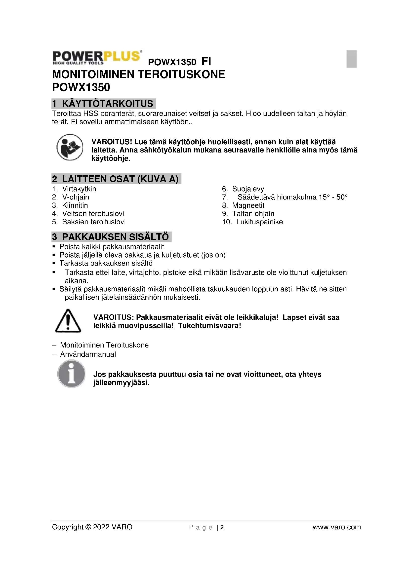 - Hionta saa aikaan kipinöitä, joten pidä kaikki helposti syttyvät aineet ja materiaalit etäällä.POWX1350 FI Copyright © 2022 VARO P a g e | 5 www.varo.com