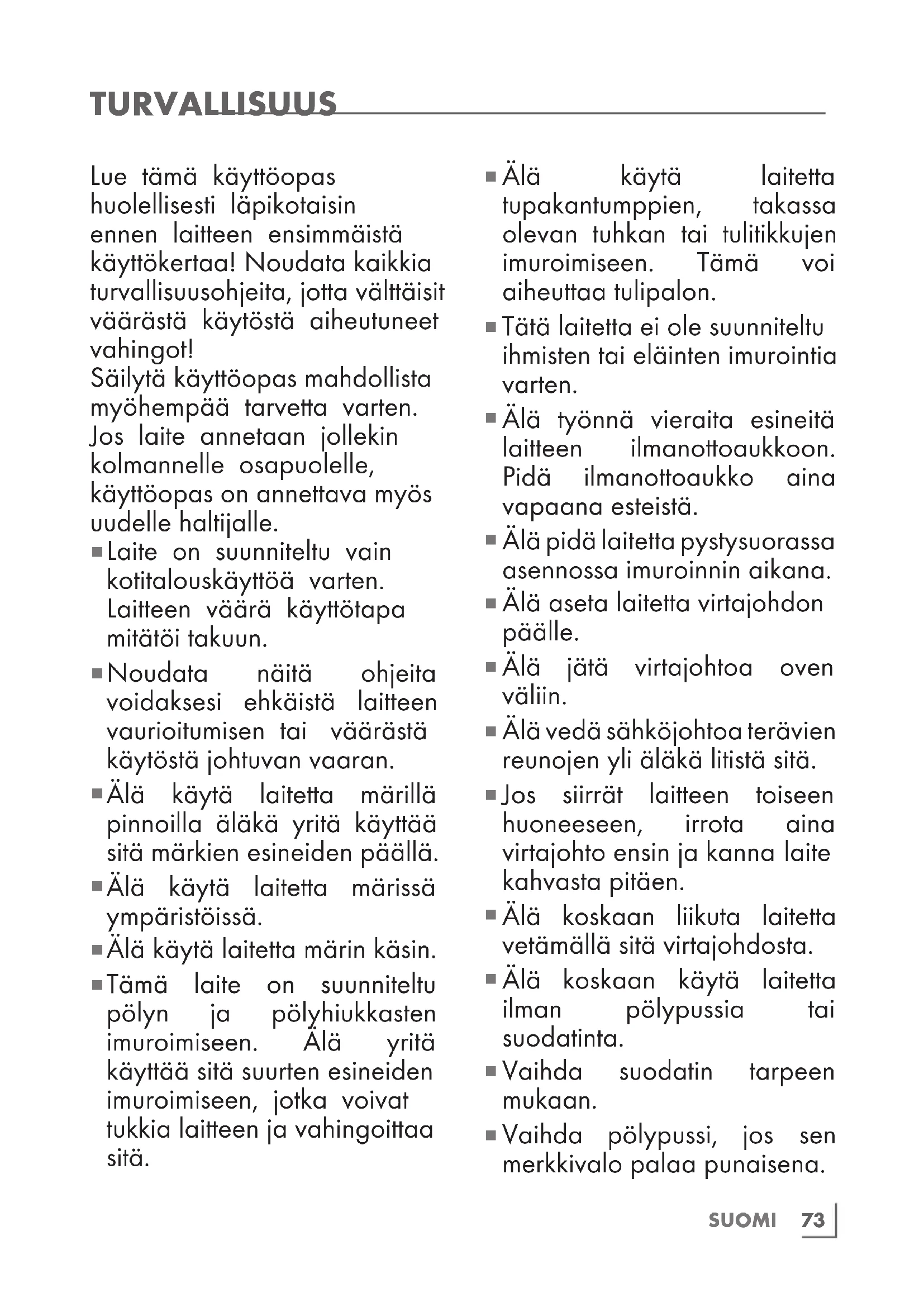 Tätä laitetta ei ole suunniteltu ihmisten tai eläinten imurointia varten.