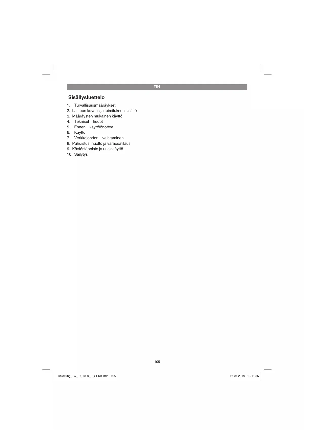 Säilytä laite ja sen varusteet valolta, kosteudelta ja pakkaselta suojatussa tilassa poissa lasten ulottuvilta. Paras säilytyslämpötila on 5°C ja 30°C välillä. Säilytä sähkötyökalut alkuperäispakkauk- sissaan. Anleitung_TC_ID_1000_E_SPK9.indb 111Anleitung_TC_ID_1000_E_SPK9.indb 111 16.04.2018 13:11:5516.04.2018 13:11:55FIN