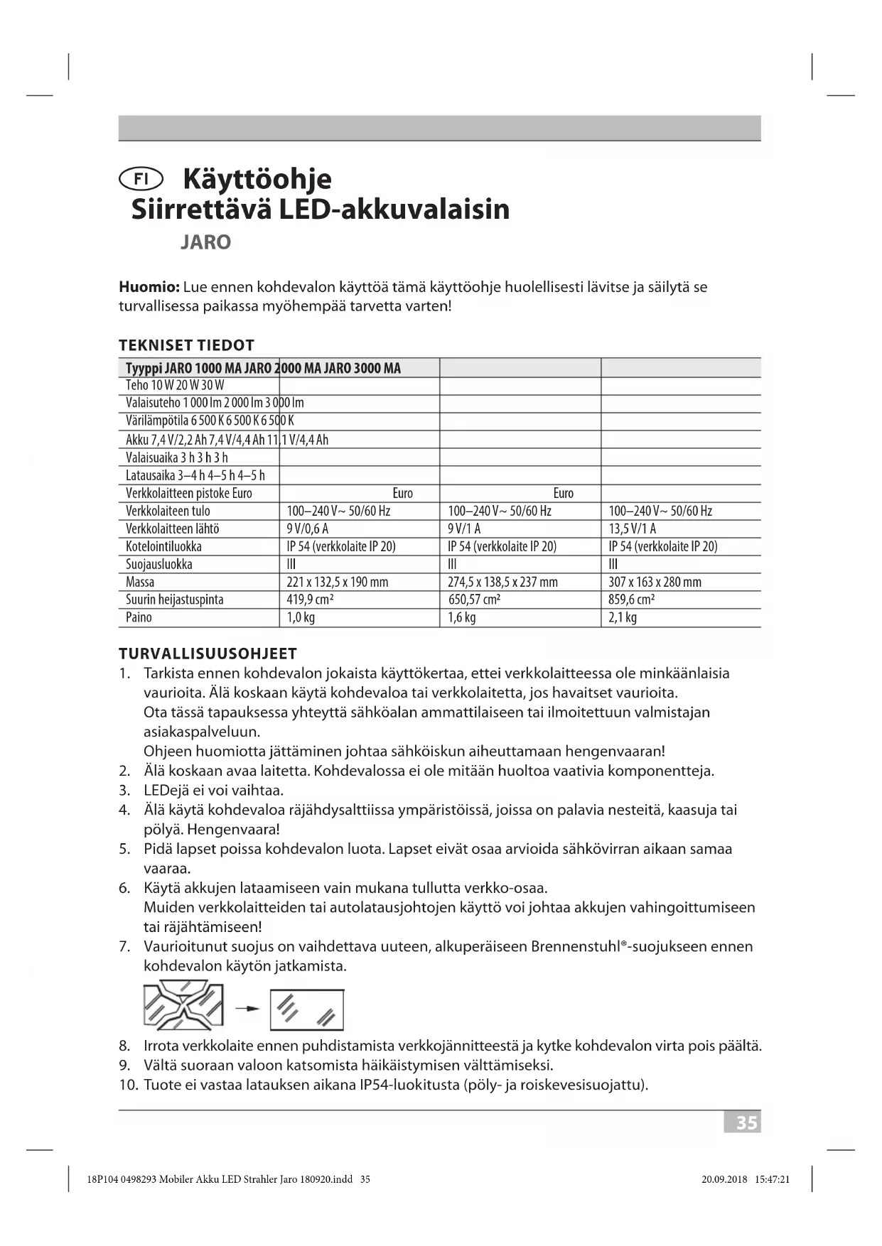 Hävitä sähkölaitteet ympäristöystävällisesti! Sähkölaitteita ei saa hävittää kotitalousjätteen mukana! Vanhoja sähkö- ja elektroniikkalaitteita koskevan eurooppalaisen direktiivin 2012/19/EU mukaan käytetyt sähkölaitteet on kerättävä erikseen ja toimitettava kierrätyspisteeseen ympäristöä kunnioittaen. Tietoja vanhan laitteen hävittämismahdollisuuksista saat kunnan- tai kaupunginviranomaisilta. Paristojen ja akkujen epäasianmukainen hävittäminen on haitallista ympäristölle! Paristot ja akut eivät kuulu kotitalousjätteisiin. Ne saattavat sisältää myrkyllisiä raskasme- talleja ja kuuluvat ongelmajätteisiin. Vie käytetyt paristot ja akut kunnalliseen keräyspis- teeseen. VAATIMUSTENMUKAISUUSVAKUUTUS Valmistaja on antanut vaatimustenmukaisuusvakuutuksen. Osoitteet Hugo Brennenstuhl GmbH & Co. KG Seestraße 1 – 3 · D-72074 Tübingen H. Brennenstuhl S.A.S. 4 rue de Bruxelles ∙ F-67170 Bernolsheim lectra-t ag Blegistrasse 13 · CH-6340 Baar www.brennenstuhl.com 18P104 0498293 Mobiler Akku LED Strahler Jaro 180920.indd 37 20.09.2018 15:47:2238 H Οδηγίες Χρήσης Φορητός προβολέας LED με μπαταρία JARO Προσοχή: Παρακαλούμε διαβάστε με προσοχή πριν από τη χρήση του προβολέα τις παρούσες οδηγίες χρήσης και στη συνέχεια φυλάξτε τις! TΕΧΝΙΚΕΣ ΠΡΟΔΙΑΓΡΑΦΕΣ Τύπος JARO 1000 MA JARO 2000 MA JARO 3000 MA Απόδοση 10 W 20 W 30 WΕκπομπή φωτός 1 000 lm 2 000 lm 3 000 lmΘερμοκρασία χρώματος 6 500 K 6 500 K 6 500 KΣυσσωρευτής 7,4 V/2,2 Ah 7,4 V/4,4 Ah 11,1 V/4,4 AhΔιάρκεια φωτισμού 3 ώρες 3 ώρες 3 ώρεςΔιάρκεια φόρτισης 3-4 ώρες 4-5 ώρες 4-5 ώρεςΦις τροφοδοτικού Ευρώ Ευρώ Ευρώ Είσοδος τροφοδοτικού 100-240 V~ 50/60 Hz 100-240 V~ 50/60 Hz 100-240 V~ 50/60 Hz Έξοδος τροφοδοτικού 9 V/0,6 A 9 V/1 A 13,5 V/1 A Προστασία IP 54 (τροφοδοτικό IP 20) IP 54 (τροφοδοτικό IP 20) IP 54 (τροφοδοτικό IP 20) Κατηγορία προστασίας III III III Μάζα 221 x 132,5 x 190 mm 274,5 x 138,5 x 237 mm 307 x 163 x 280 mm μέγιστη επιφάνεια προβολής 419,9 cm 650,57 cm 859,6 cm Βάρος 1,0 kg 1,6 kg 2,1 kg ΥΠΟΔΕΙΞΕΙΣ ΑΣΦΑΛΕΙΑΣ