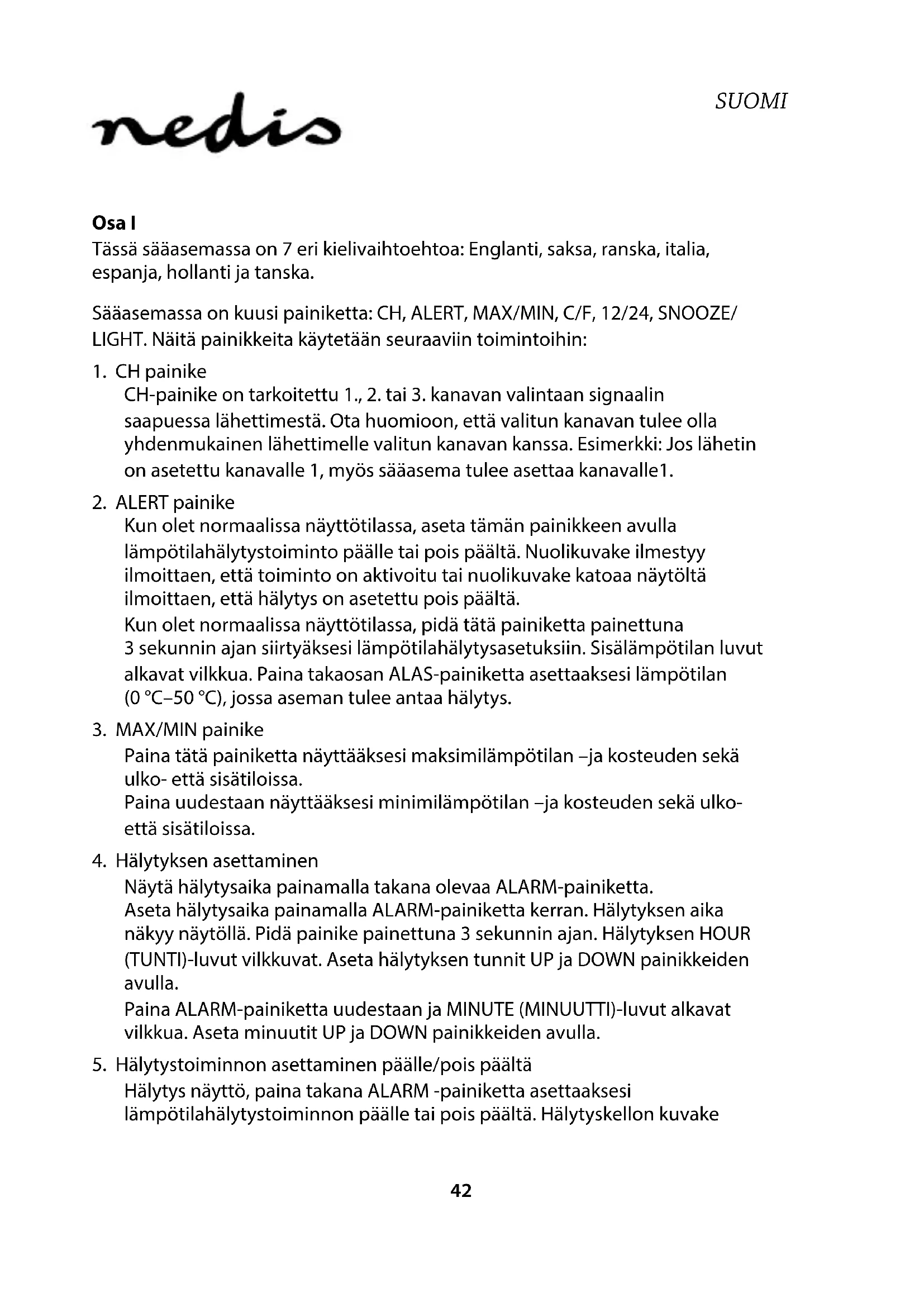 Osa I Tässä sääasemassa on 7 eri kielivaihtoehtoa: Englanti, saksa, ranska, italia, espanja, hollanti ja tanska. Sääasemassa on kuusi painiketta: CH, ALERT, MAX/MIN, C/F, 12/24, SNOOZE/ LIGHT. Näitä painikkeita käytetään seuraaviin toimintoihin:
