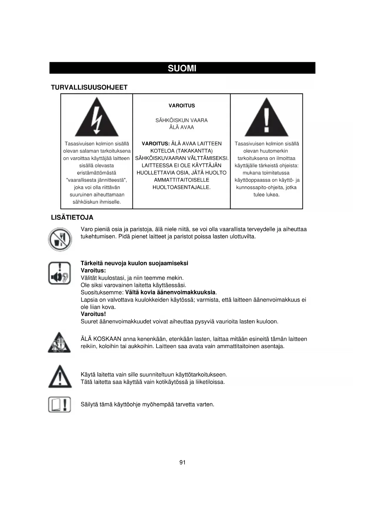 ÄLÄ KOSKAAN anna kenenkään, etenkään lasten, laittaa mitään esineitä tämän laitteen reikiin, koloihin tai aukkoihin. Laitteen saa avata vain ammattitaitoinen asentaja.