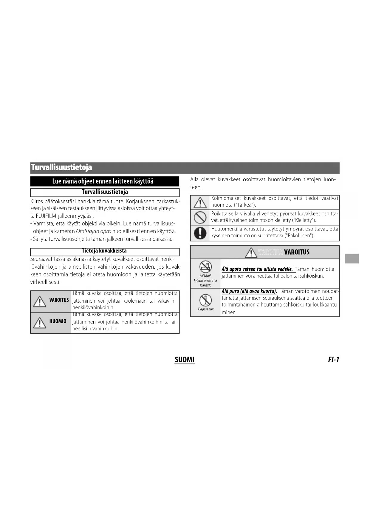 - Säilytä turvallisuusohjeita tämän jälkeen turvallisessa paikassa. Tietoja kuvakkeista Seuraavat tässä asiakirjassa käytetyt kuvakkeet osoittavat henki- lövahinkojen ja aineellisten vahinkojen vakavuuden, jos kuvak- keen osoittamia tietoja ei oteta huomioon ja laitetta käytetään virheellisesti. VAROITUSTämä kuvake osoittaa, että tietojen huomiotta jättäminen voi johtaa kuolemaan tai vakaviin henkilövahinkoihin.HUOMIOTämä kuvake osoittaa, että tietojen huomiotta jättäminen voi johtaa henkilövahinkoihin tai ai-neellisiin vahinkoihin. Alla olevat kuvakkeet osoittavat huomioitavien tietojen luon- teen. Kolmiomaiset kuvakkeet osoittavat, että tiedot vaativat huomiota ("Tärkeä").Poikittaisella viivalla ylivedetyt pyöreät kuvakkeet osoitta-vat, että kyseinen toiminto on kielletty (”Kielletty”).Huutomerkillä varustetut täytetyt ympyrät osoittavat, että kyseinen toiminto on suoritettava ("Pakollinen"). VAROITUSVAROITUS Älä käytä kylpyhuoneessa tai suihkussaÄlä upota veteen tai altista vedelle. Tämän huomiotta jättäminen voi aiheuttaa tulipalon tai sähköiskun. Älä pura osiinÄlä pura (älä avaa kuorta). Tämän varotoimen noudat-tamatta jättämisen seurauksena saattaa olla tuotteen toimintahäiriön aiheuttama sähköisku tai loukkaantu-minen.FI-2 SUOMI VAROITUSVAROITUS Älä kosketa sisäisiin osiin Jos kameran kuori rikkoutuu putoamisen tai muun vahin- gon seurauksena, älä kosketa esiin tulleisiin osiin. Tämän varotoimen noudattamatta jättämisen seurauksena saattaa olla vaurioituneiden osien koskettamisen ai- heuttama sähköisku tai loukkaantuminen. Poista ka- meran akku välittömästi, mutta varo loukkaantumista ja sähköiskua. Vie tuote sen ostopaikkaan, josta saat jatko-ohjeita. Älä aseta epävakaille alustoille. Tuote saattaa tippua aiheuttaen vahinkoa. Älä katsele aurinkoa objektiivin tai kameran etsimien läpi. Tämän varotoimen noudattamatta jättäminen saattaa johtaa pysyvään näön heikkenemiseen. HUOMIOHUOMIO Älä käytä tai säilytä paikoissa, jotka ovat alttiita höyrylle tai savulle tai ovat erittäin kosteita tai pölyisiä. Tämän varotoimen huomiotta jättäminen voi aiheuttaa tuli- palon tai sähköiskun. Älä jätä suoraan auringonvaloon tai paikkoihin, jotka ovat alttiina erittäin korkeille lämpötiloille, kuten sul- jettuun ajoneuvoon aurinkoisena päivänä. Tämän varo- toimen noudattamatta jättäminen saattaa aiheuttaa tulipalon. HUOMIOHUOMIO Pidä poissa pienten lasten ulottuvilta. Lapsen käsissä laite voi aiheuttaa henkilövahinkoja. Älä käsittele märin käsin. Tämän varotoimen noudatta- matta jättäminen voi aiheuttaa sähköiskun. Pidä aurinko poissa rajauksesta, kun kuvaat taustavalais- tuja kohteita. Auringonvalon tarkentuminen kame- raan, kun aurinko on rajauksessa tai lähellä sitä, saattaa aiheuttaa tulipalon tai palovammoja. Kun tuotetta ei käytetä, aseta objektiivin suojukset pai- koilleen ja säilytä suoran auringonvalon ulottumatto- missa. Objektiivin kohdistama auringonvalo saattaa aiheuttaa tulipalon tai palovammoja. Älä kanna kameraa tai objektiivia, kun ne ovat kiinnitet- tyinä kolmijalkaan. Tuote voi pudota tai osua muualle aiheuttaen vahinkoa.FI-3 SUOMI Sähköisten ja elektronisten laitteiden hävittäminen kotitalouksissaSähköisten ja elektronisten laitteiden hävittäminen kotitalouksissa Euroopan unioni, Norja, Islanti ja Liechtenstein: Tämä symboli tuotteessa tai käyttöohjeessa ja takuussa ja/tai tuotteen pakkauksessa tarkoittaa, että tuotetta ei voi pitää kotitalousjätteenä. Sen sijaan tuote tulee toimittaa soveltuvaan sähköisten ja elektronisten laitteiden keräyspisteeseen. Varmistamalla tämän tuotteen asianmukaisen hävittämisen autat estämään mahdollisia haittavaikutuksia ympäristölle ja ihmisten terveydelle, joita saattaisi olla seurauksena tuotteen epäasianmukaisesta hävittämisestä. Raaka-aineiden kierrättäminen auttaa säästämään luonnonvaroja. Lisätietoa tuotteen kierrättämisestä saat paikallisilta viranomaisilta, jätehuollosta tai liikkeestä, josta ostit tuotteen. Maat Euroopan unionin, Norjan, Islannin ja Liechtensteinin ulkopuolella: Halutessasi hävittää tuotteen, mukaan lukien paristot ja akut, ota yhteyttä paikalliseen viranomaiseen kysyäksesi asianmukaisesta hävittämisestä.FI-4 SUOMI Ennen tuotteen käyttöä Kaikki objektiivin toiminnot eivät ole käytettä- vissä kameran laiteohjelmiston vanhemmilla versioilla. Päivitä kameran laiteohjelmisto uu- simpaan versioon. Ohjeet kameran laiteohjel- miston version tarkistamiseen ja päivittämi- seen löytyvät seuraavalta verkkosivulta: http://www.fujifilm.com/support/digital_cameras/ software/#firmware Jos sinulla ei ole mahdollisuutta käyttää tieto- konetta, apua saa paikalliselta maahantuojalta, jonka tiedot löydät kameran mukana toimite- tusta ”FUJIFILMIN maailmanlaajuinen verkosto” -materiaalista. Tuotteen huoltaminen