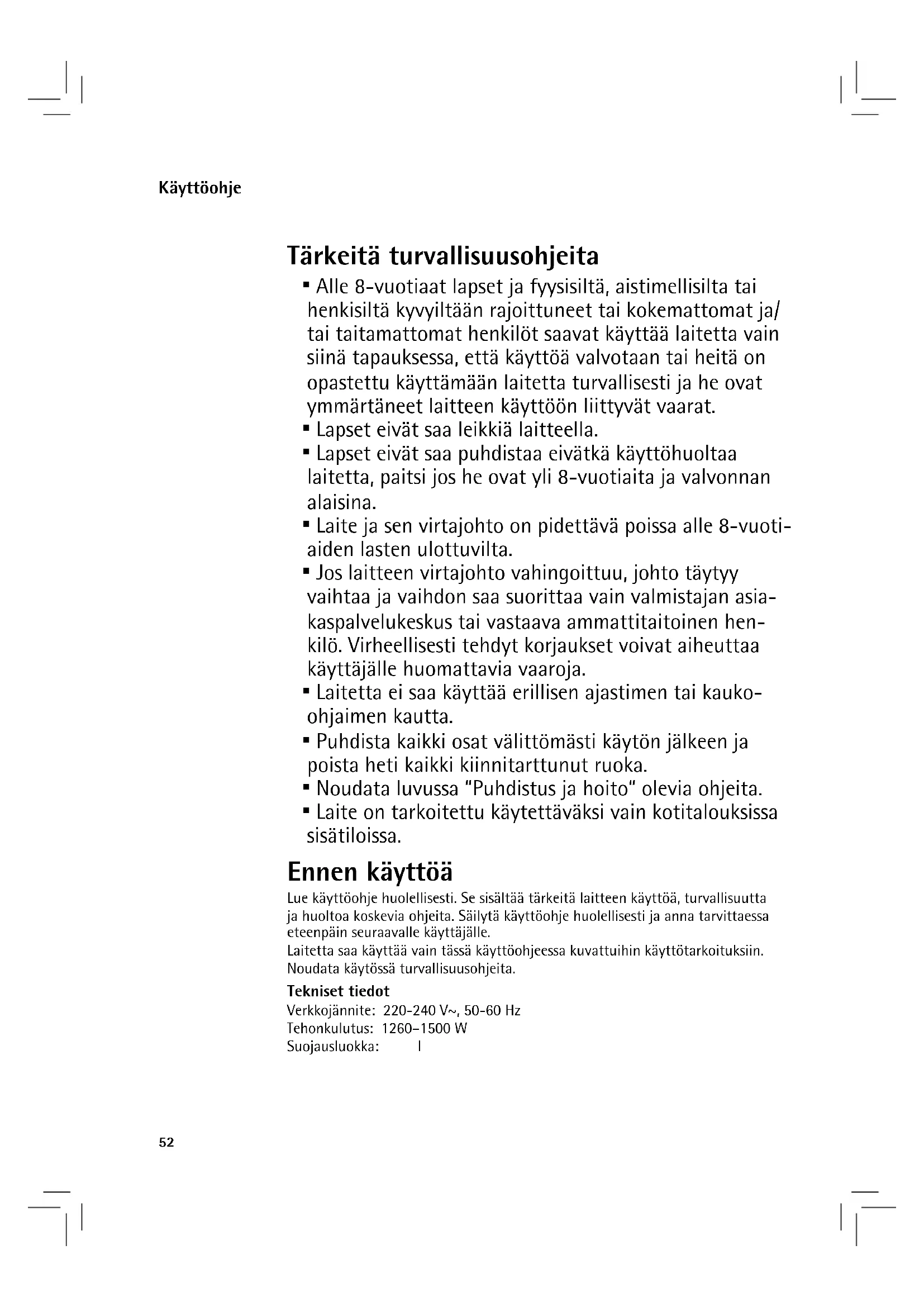 - Laite on tarkoitettu käytettäväksi vain kotitalouksissa sisätiloissa. Ennen käyttöä Lue käyttöohje huolellisesti. Se sisältää tärkeitä laitteen käyttöä, turvallisuutta ja huoltoa koskevia ohjeita. Säilytä käyttöohje huolellisesti ja anna tarvittaessa eteenpäin seuraavalle käyttäjälle. Laitetta saa käyttää vain tässä käyttöohjeessa kuvattuihin käyttötarkoituksiin. Noudata käytössä turvallisuusohjeita. Tekniset tiedot Verkkojännite: 220-240 V~, 50-60 Hz Tehonkulutus: 1260–1500 W Suojausluokka: I53