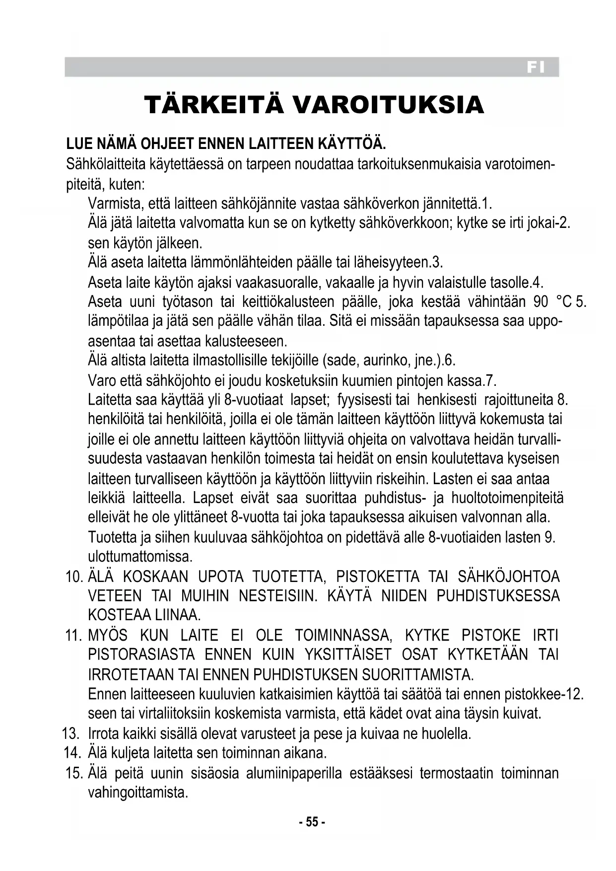 LUE NÄMÄ OHJEET ENNEN LAITTEEN KÄYTTÖÄ. Sähkölaitteita käytettäessä on tarpeen noudattaa tarkoituksenmukaisia varotoimen- piteitä, kuten: Varmista, että laitteen sähköjännite vastaa sähköverkon jännitettä.1. Älä jätä laitetta valvomatta kun se on kytketty sähköverkkoon; kytke se irti jokai-2. sen käytön jälkeen. Älä aseta laitetta lämmönlähteiden päälle tai läheisyyteen.3. Aseta laite käytön ajaksi vaakasuoralle, vakaalle ja hyvin valaistulle tasolle.4. Aseta uuni työtason tai keittiökalusteen päälle, joka kestää vähintään 90 °C 5. lämpötilaa ja jätä sen päälle vähän tilaa. Sitä ei missään tapauksessa saa uppo- asentaa tai asettaa kalusteeseen. Älä altista laitetta ilmastollisille tekijöille (sade, aurinko, jne.).6. Varo että sähköjohto ei joudu kosketuksiin kuumien pintojen kassa.7. Laitetta saa käyttää yli 8-vuotiaat lapset; fyysisesti tai henkisesti rajoittuneita 8. henkilöitä tai henkilöitä, joilla ei ole tämän laitteen käyttöön liittyvä kokemusta tai joille ei ole annettu laitteen käyttöön liittyviä ohjeita on valvottava heidän turvalli- suudesta vastaavan henkilön toimesta tai heidät on ensin koulutettava kyseisen laitteen turvalliseen käyttöön ja käyttöön liittyviin riskeihin. Lasten ei saa antaa leikkiä laitteella. Lapset eivät saa suorittaa puhdistus- ja huoltotoimenpiteitä elleivät he ole ylittäneet 8-vuotta tai joka tapauksessa aikuisen valvonnan alla. Tuotetta ja siihen kuuluvaa sähköjohtoa on pidettävä alle 8-vuotiaiden lasten 9. ulottumattomissa. ÄLÄ KOSKAAN UPOTA TUOTETTA, PISTOKETTA TAI SÄHKÖJOHTOA 10. VETEEN TAI MUIHIN NESTEISIIN. KÄYTÄ NIIDEN PUHDISTUKSESSA KOSTEAA LIINAA. MYÖS KUN LAITE EI OLE TOIMINNASSA, KYTKE PISTOKE IRTI 11. PISTORASIASTA ENNEN KUIN YKSITTÄISET OSAT KYTKETÄÄN TAI IRROTETAAN TAI ENNEN PUHDISTUKSEN SUORITTAMISTA. Ennen laitteeseen kuuluvien katkaisimien käyttöä tai säätöä tai ennen pistokkee-12. seen tai virtaliitoksiin koskemista varmista, että kädet ovat aina täysin kuivat. Irrota kaikki sisällä olevat varusteet ja pese ja kuivaa ne huolella.13. Älä kuljeta laitetta sen toiminnan aikana.14. Älä peitä uunin sisäosia alumiinipaperilla estääksesi termostaatin toiminnan 15. vahingoittamista.FI