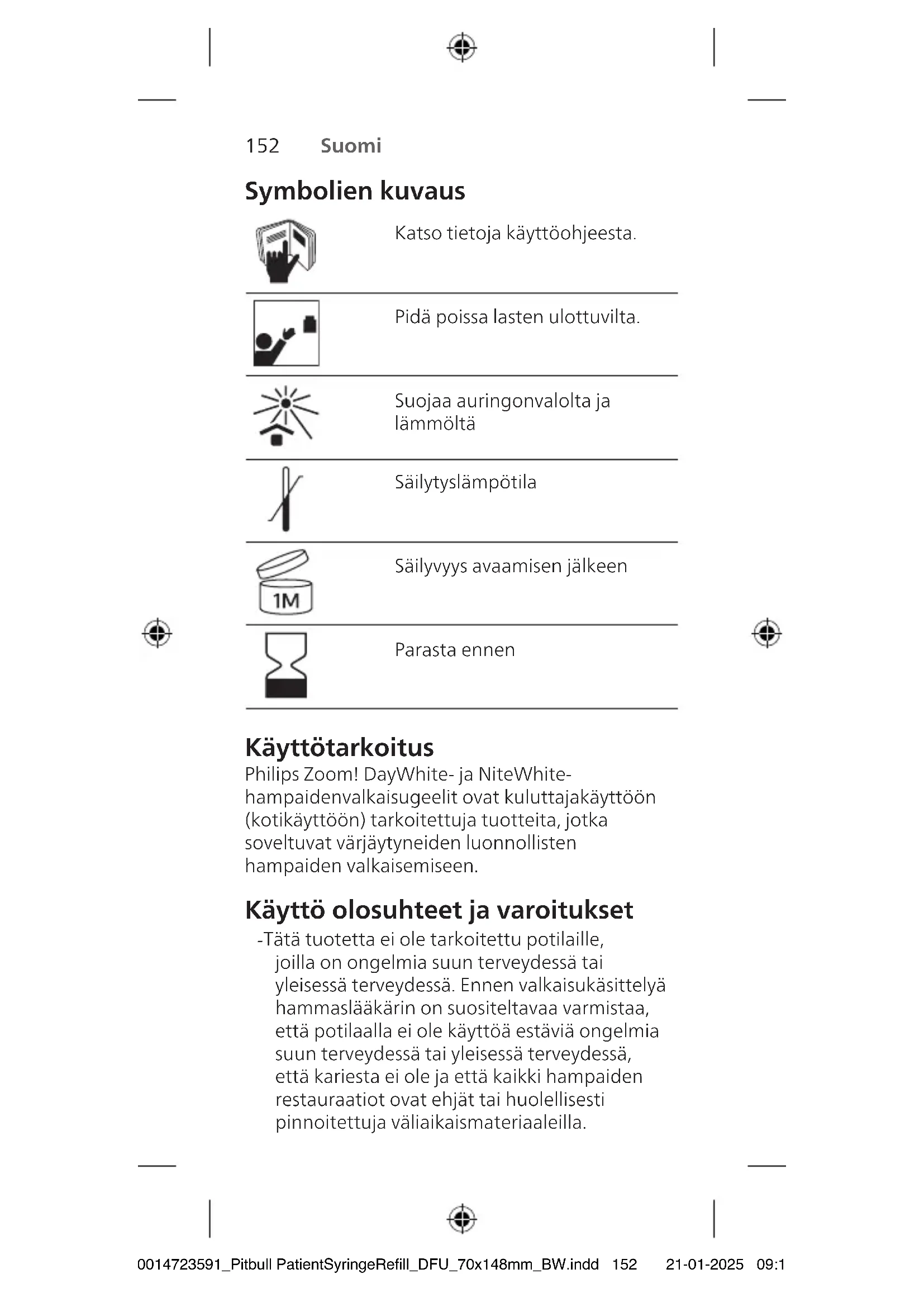- 9 Huuhtele lusikat kylmällä vedellä valkaisun jälkeen. Poista tarvittaessa jäljelle jäänyt geeli lusikoista hammasharjalla. Aseta lusikat säilytyskoteloon ja anna niiden kuivua ennen kotelon sulkemista. Varoitus: Älä käytä kuumaa vettä tai astianpesukonetta lusikoiden puhdistamiseen. Muuten niiden muoto muuttuu. Huomautus: Tummentumien esiintyminen lusikoissa on normaalia, jos sinulla on amalgaamipaikkoja. Geeli hapettaa amalgaamipaikkojen pintatahrat, mutta se ei vaikuta valkaisuprosessiin. 10 Poista ylimääräinen geeli huuhtelemalla ja harjaamalla hampaasi. 11 Säilytä lusikoita ja ruiskuja viileässä, kuivassa paikassa, jonka lämpötila on 15–25°C. Älä säilytä geeliä jääkaapissa tai pakastimessa. Käsittelyaika Tuotteen nimi Suositeltava käyttöaika DayWhite 6% HP 30–60minuuttia kerran päivässä tai 30–45minuuttia kahdesti päivässä NiteWhite 10% CP 4–6 tuntia kerran päivässä tai yön yli NiteWhite 16% CP 4–6 tuntia kerran päivässä tai yön yli - Jos mahdollista, sovi seurantakäynti hammaslääkärin vastaanotolle lopputuloksen arvioimiseksi kahden viikon kuluttua valkaisun aloittamisesta. - Yhden hoidon kesto on enintään kaksi viikkoa. Voit toistaa hoidon muutaman kuukauden välein, jotta hymysi säilyy valkoisena. Jälkikäsittely - Vältä värjääviä ruokia, juomia (kuten kahvia, teetä ja punaviiniä) sekä tupakointia 30minuutin ajan kunkin käsittelyn jälkeen. - Pidä hyvää huolta hammashygieniasta harjaamalla kahdesti päivässä ja käyttämällä hammaslankaa. - Pyydä hammaslääkäriä arvioimaan hampaidesi sävy säännöllisessä puolivuotistarkastuksessa. Mahdolliset haittavaikutukset Peroksidia sisältävän valkaisutuotteen käyttämiseen voi liittyä seuraavia muun muassa alla mainittuja haittavaikutuksia. Herkkyys - Potilaat, joilla on paljastuneita juuripintoja, rikkinäisiä restauraatioita, paljastunutta hammasluuta, pehmytkudosvaurioita, parodontaalinen sairaus, vetäytyneet ikenet, 300014723591_Pitbull PatientSyringeRefill_DFU_70x148mm_BW.indd 159300014723591_Pitbull PatientSyringeRefill_DFU_70x148mm_BW.indd 159 21-01-2025 09:1121-01-2025 09:11Suomi 161 160 Suomi hoitamaton karies, haljenneita hampaita, hammasvaurioita, paikkaamattomia reikiä tai vuotavia täytteitä, ovat alttiimpia yliherkkyysreaktioille. - Toisilla potilailla voi esiintyä hampaiden kylmäherkkyyttä hoidon aikana, kun taas toisilla voi esiintyä epämääräistä yliherkkyyttä hampaissa sekä ärsytystä ikenissä, kielessä, huulissa tai kurkussa. Oireiden pitäisi poistua 1–3 päivän kuluessa. - Jos hampaissa esiintyy yliherkkyyttä, kokeile valkaisua vain joka toinen päivä tai joka kolmas päivä tai yö tai pyydä hammaslääkäriltä laimeampaa geeliä. - Pyydä hammaslääkäriltä 5-prosenttista kaliumnitraattihammastahnaa. - Kipua voidaan lievittää steroideihin kuulumattomalla tulehduskipulääkkeellä, jota on käytettävä lääkkeen ohjeiden ja hammaslääkärin suosituksen mukaisesti. Ikenien ärsytys - Kun valkaisugeeli pääsee kosketuksiin ikenien kanssa, se voi aiheuttaa ikenien ärsytystä. Tämä voi aiheuttaa punoitusta, polttavaa tunnetta tai valkoisia täpliä ikenissä. - Ikenien päälle ulottuvat lusikat voivat aiheuttaa lievää tai vaikeaa pehmytkudosärsytystä. Jos lusikat ulottuvat ikenien päälle, vie ne hammaslääkärille muokattavaksi. - Vähennä geelin määrää lusikoissa ja ole erityisen varovainen, jotta geeliä ei pääse ikeniin. Poista liiallinen geeli vanupuikolla tai kuivalla hammasharjalla. Jos edellä mainitut vaihtoehdot on kokeiltu ja sinulla esiintyy yhä ienärsytystä tai yliherkkyyttä, käsittely on keskeytettävä, kunnes ärsytysoireet poistuvat. Jatka käsittelyä lyhentämällä ja harventamalla käyttökertoja, kunnes haluttu valkaisutulos saavutetaan. Jos oireet jatkuvat, keskeytä käsittely ja ota yhteyttä hammaslääkäriin. Säilytysohjeet Säilytä tuotetta pimeässä ja kuivassa paikassa, jonka lämpötila on15–25°C. Tuotteen säilyvyys heikkenee, jos säilytyslämpötila on korkeampi kuin 25°C. Hävitysohjeet Tuote on hävitettävä paikallisten jätehuoltomääräysten mukaisesti. Takuu Philips vakuuttaa, että tämän tuotteen valmistuksessa on noudatettu asianmukaista huolellisuutta. Tämä takuu korvaa ja sulkee pois kaikki muut takuut, joita ei nimenomaisesti mainita tässä, ovatpa ne sitten oletettuja tai ilmaistuja lain perusteella tai muuten, mukaan lukien, mutta muitakaan pois sulkematta, mitkä tahansa takuut sopivuudesta kaupankäynnin kohteeksi tai mihin tiettyyn käyttötarkoitukseen. 300014723591_Pitbull PatientSyringeRefill_DFU_70x148mm_BW.indd 160300014723591_Pitbull PatientSyringeRefill_DFU_70x148mm_BW.indd 160 21-01-2025 09:1121-01-2025 09:11Suomi 161 160 Suomi hoitamaton karies, haljenneita hampaita, hammasvaurioita, paikkaamattomia reikiä tai vuotavia täytteitä, ovat alttiimpia yliherkkyysreaktioille. - Toisilla potilailla voi esiintyä hampaiden kylmäherkkyyttä hoidon aikana, kun taas toisilla voi esiintyä epämääräistä yliherkkyyttä hampaissa sekä ärsytystä ikenissä, kielessä, huulissa tai kurkussa. Oireiden pitäisi poistua 1–3 päivän kuluessa. - Jos hampaissa esiintyy yliherkkyyttä, kokeile valkaisua vain joka toinen päivä tai joka kolmas päivä tai yö tai pyydä hammaslääkäriltä laimeampaa geeliä. - Pyydä hammaslääkäriltä 5-prosenttista kaliumnitraattihammastahnaa. - Kipua voidaan lievittää steroideihin kuulumattomalla tulehduskipulääkkeellä, jota on käytettävä lääkkeen ohjeiden ja hammaslääkärin suosituksen mukaisesti. Ikenien ärsytys - Kun valkaisugeeli pääsee kosketuksiin ikenien kanssa, se voi aiheuttaa ikenien ärsytystä. Tämä voi aiheuttaa punoitusta, polttavaa tunnetta tai valkoisia täpliä ikenissä. - Ikenien päälle ulottuvat lusikat voivat aiheuttaa lievää tai vaikeaa pehmytkudosärsytystä. Jos lusikat ulottuvat ikenien päälle, vie ne hammaslääkärille muok